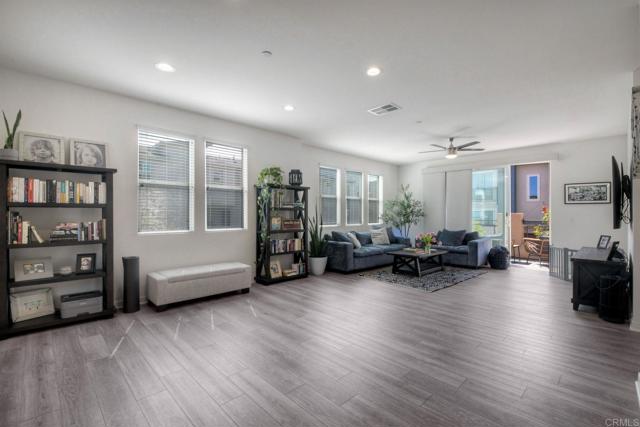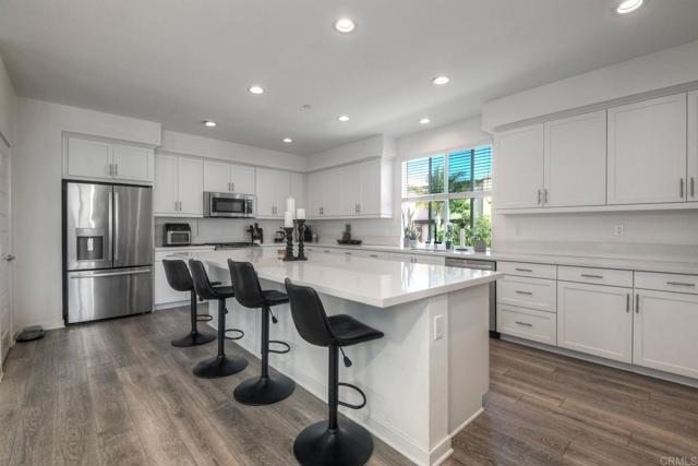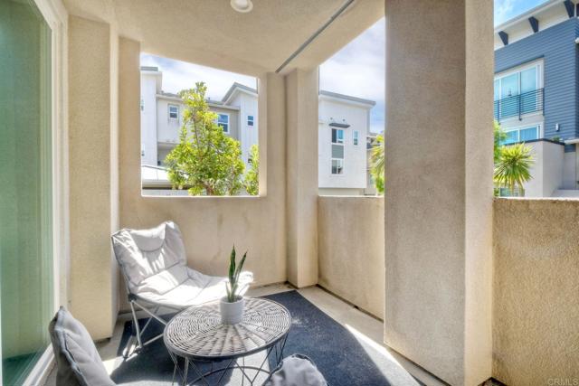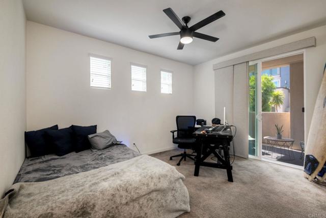 Rare corner residence in Kensington at the Square with no neighbor on one side, owned solar, EV charging, and steps to Bressi Ranch Village. Positioned on the outer edge of the building, this desirable home enjoys added privacy, extra windows, and refreshing coastal breezes that create a bright, open feel throughout. This upgraded tri-level townhome features new carpet, updated kitchen and bathrooms, and a flexible layout including a first-floor bedroom with private patio, ideal for guests, an office, or workout space. The open-concept second level showcases the updated kitchen flowing into the living room, with a private balcony perched above the bocce ball court and neighborhood, creating a perfect place to relax or entertain. Energy-efficient living includes owned solar, smart home features, an EV charger in the garage with additional storage, plus additional community EV charging stations. Located adjacent to Bressi Ranch Village, simply step outside and walk to restaurants, coffee, fitness studios, parks, and shopping, all while enjoying the peaceful setting of this beautifully maintained Carlsbad neighborhood.