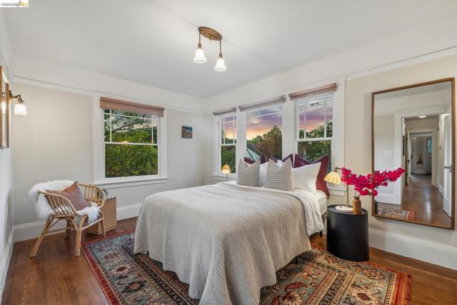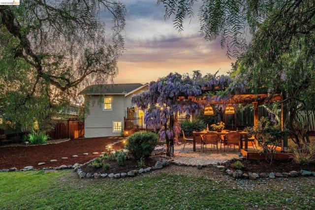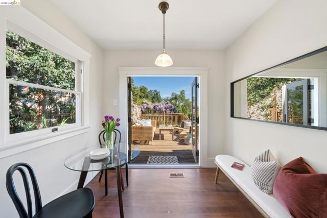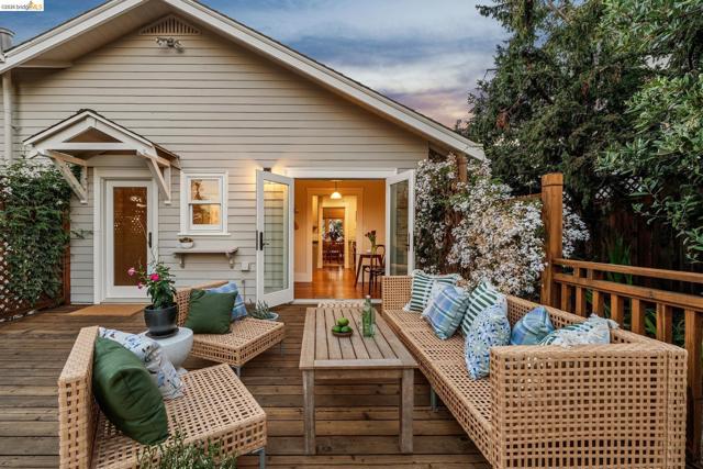 Unicorn Alert! Sweet California Bungalow is ultimate find in hidden gem Upper Dimond neighborhood. 1920s character w/ lovely kitchen & bath thoughtfully refreshed for modern living. Fluid & open, the floor plan spills naturally onto an expansive rear deck & flared double wide tree-lined backyard on generous .26-acre lot. Charming details: trayed ceilings, tile fireplace, refinished hardwood & softwood floor, w/ well preserved original hardware & lighting. Thoughtful kitchen updated w/ new soapstone countertops, appliances, hardware, & tile backsplash, blending designer-painted cabinetry, built-in hutch & wainscotting. Refreshed bath features new tile, vanity, plumbing, & wainscoting, plus storage. Living & dining rooms lead through kitchen to light-filled breakfast nook w/ French doors opening to large rear deck. Sprawling tree-lined yard is dreamy retreat w/ wisteria arbor & professional landscaping touches. 2 bed & updated bath on main level. Private 3rd bed is above garage w/ dual closets & peekaboo Bay/Hills views. Perfect for future primary suite. Home is well-equipped: updated wiring throughout, laundry room off kitchen w/ side-by-side W/D, attached garage, attic storage, insulated ceiling, forced air heat. Steps to Farmer Joes, Peets, Dimond Park. EZ access to 13/580.