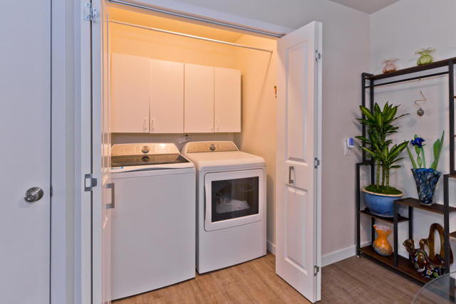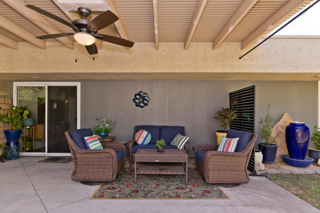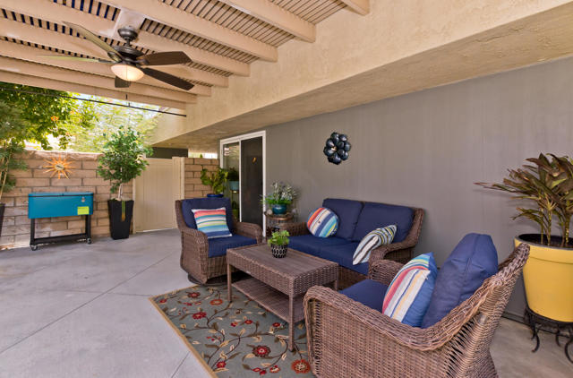 Welcome to 1221 Sunflower Lane, a light-filled retreat with expansive private garden in a resort-style community. This beautifully updated 2-bedroom, 2-bath home, featuring the largest floor plan in the development, welcomes you through a frosted glass entry door, filling the living and dining space with natural light. The adjacent, freshly updated, kitchen features bright white cabinetry, solid surface countertops, a stunning tiled backsplash, and a convenient pantry. The primary suite is a true retreat with garden access, a newly refreshed bath highlighted by a gorgeous tiled shower, and equipped with a large walk-in closet. The hallway to the bedrooms is lined with custom built-in cabinets, offering abundant storage. Sliding glass doors in the living area open to an expansive private patio and an oversized wraparound garden, where you'll find prize-winning roses, newly planted trees, built-in seating, and a covered patio for year-round enjoyment. A private gate provides direct access to a path leading to the nearest pool and spa. Additional features include indoor laundry area with side-by-side washer & dryer, spacious second bedroom and bath for guests, private single car garage, and fresh landscaping with multiple outdoor living spaces. Beyond the home, enjoy a vibrant community lifestyle with 8 sparkling pools and spas, separate pickleball and tennis courts, basketball courts, putting green, and a pet play space -- all just steps away. This home offers the perfect balance of comfort, charm, and resort-style living--ready for you to move right in.