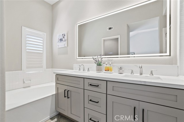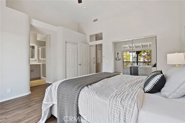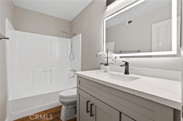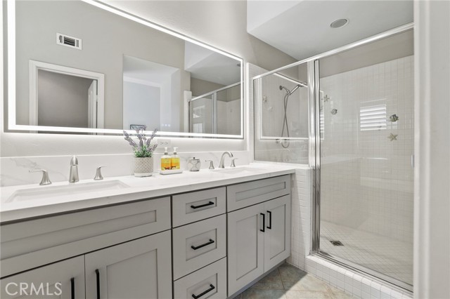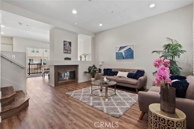 Beautifully remodeled condo within the Venturanza Del Verde community in the highly sought-after Tustin Ranch area. Contemporary and move-in ready! Living room features high ceiling with recessed lighting, double-sided gas fireplace, and sleek plantation shutters. Kitchen features stainless steel appliances, new shaker cabinets, quartz counter tops, and tiled backsplash. Upstairs includes a spacious primary suite with dual closets, two more bedrooms, and a full-sized hallway bathroom. The primary bathroom features a modern LED mirror, double-sink vanity, walk-in shower, soaking tub, and private water closet. The powder room is convenient and guest friendly. The bonus room may be used as a home office, playroom, or exercise room, etc. Additional improvements include new vinyl plank flooring, interior paint, lighting fixtures, and so much more! HOA fee covers water, trash, property insurance, exterior maintenance, and resort-style pool and spa amenities. Conveniently located near the Tustin Market Place, scenic golf course, parks, and top-rated award-winning schools.