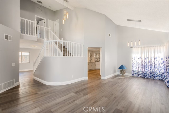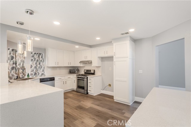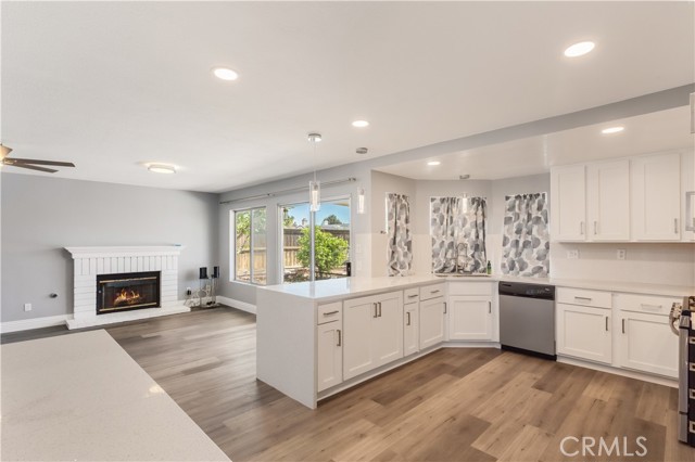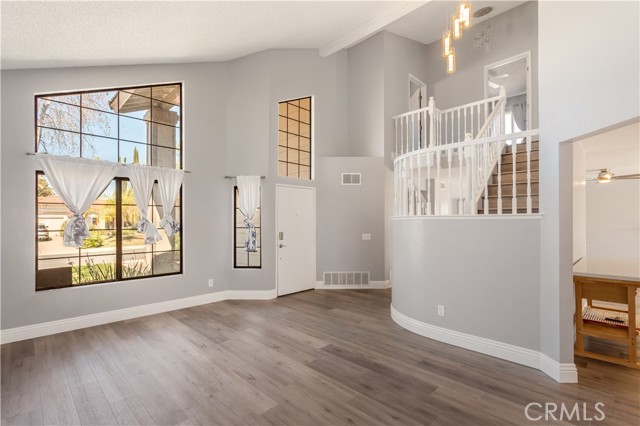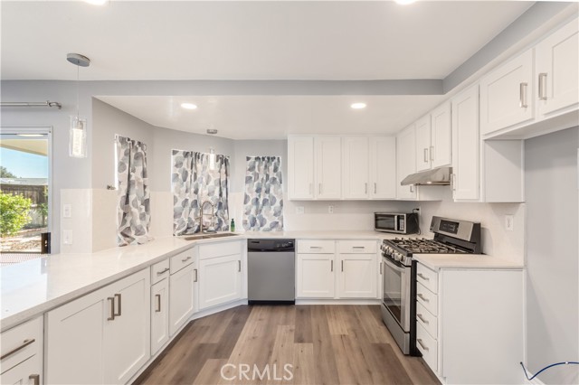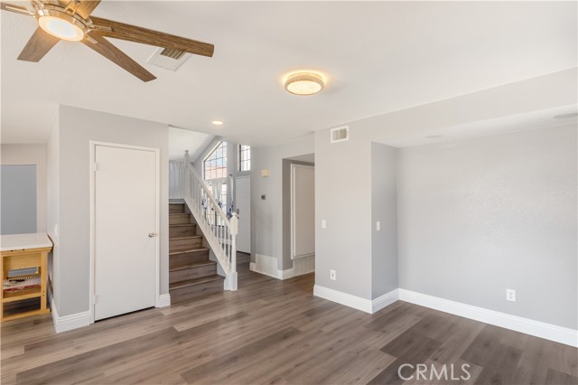Welcome to this freeway close, beautifully remodeled cul-de-sac home. This home features PAID OFF SOLAR, NO HOA AND LOW PROPERTY TAXES. The bright and open floor plan features NEW luxury vinyl plank flooring throughout the home, NO CARPET, high base boards and freshly painted interior. Enter the home and notice the vaulted ceilings in the spacious formal living and dining. The kitchen features stainless appliances, quartz counters, ample storage, recessed lights and tear drop lights over the counter bar. Kitchen opens to family area with a wonderful fireplace to warm you on those cool evenings. Family area is extra-large with room for a potential pool table or many other uses. A convenient and large downstairs bedroom offers flexible use for guests, multigenerational living, or a home office. Head upstairs where you will find nicely appointed bedrooms, joined with a jack and jill bathroom. The pleasantly appointed prime bedroom boasts of a large walk-in closet with the primary ensuite having a separate tub and shower. This home also boasts of lots of storage and an inside laundry area. Head outside to enjoy a spacious backyard featuring a covered patio and citrus tree. Located within walking distance to Windsong Park, less than one mile from 15 freeway access. Don’t miss your chance to own this turnkey home in one of Wildomar’s most convenient neighborhoods!