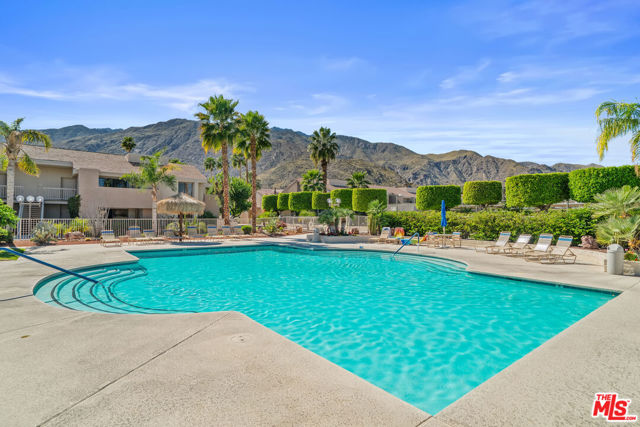 Location, Location, Location!Situated in the heart of Downtown Palm Springs, this beautifully maintained ground-floor condo places you just moments from the city's best entertainment, dining, culture, shopping, museums, casino, and spa experiences. This versatile property is perfect as a vacation getaway, full-time residence, or high-performing investment, with 7-day minimum short-term rentals permitted. The ground-floor unit features a bright open floor plan with stylish concrete flooring throughout the living area, flowing seamlessly to a spacious covered east-facing patio overlooking the pool area ideal for relaxing mornings or entertaining guests. A second private patio, accessible from both bedrooms, offers additional outdoor living space. The well-designed kitchen includes abundant cabinetry and connects to a convenient laundry/pantry area, making everyday living and hosting effortless. Both bedrooms feature newer carpet, and the home has been freshly painted throughout, making it truly move-in ready. Residents enjoy a resort-style community featuring: two sparkling pools, spa; Pickleball/tennis court; Lush desert landscaping with green & fruit trees; and Spectacular mountain views. Experience the best of Palm Springs living in a community designed for relaxation, recreation, and convenience. HOA dues include security service & internet. (See photos & floor-plan)