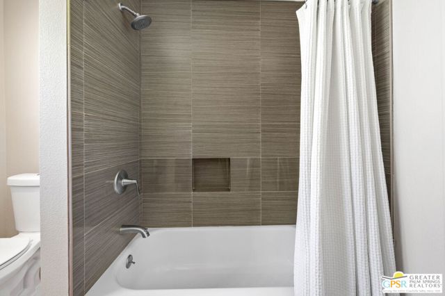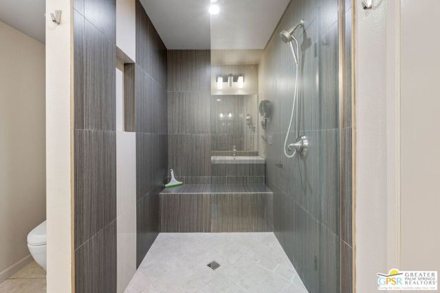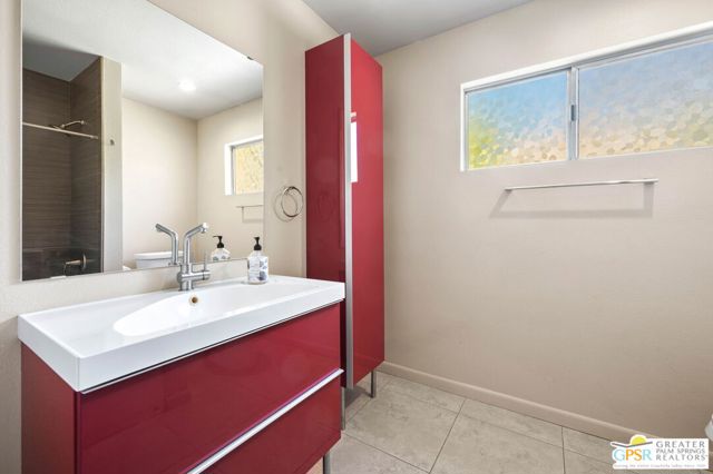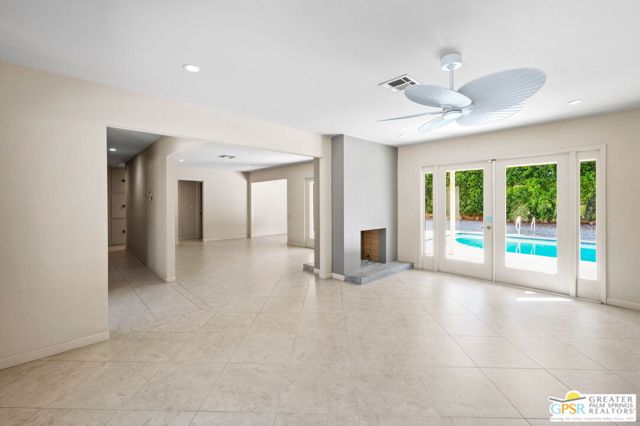 Set along the fairway on a generous, nearly quarter-acre lot, this 1965-built residence blends classic mid-century character with a fresh, modern edge. Clean lines and an open, airy layout set the tone, creating a light-filled environment that feels both relaxed and refined. French doors invite seamless indoor-outdoor living, opening to a private backyard retreat complete with pool and spa, perfect for enjoying desert sunshine and golf course views. Inside, tile flooring flows throughout, complemented by recessed lighting that enhances the home's bright, contemporary feel. The kitchen offers both style and function with stainless steel appliances, granite countertops, and a sleek glass tile backsplash. A dual-sided fireplace anchors the living and family rooms, adding warmth and architectural interest to the central gathering spaces. Thoughtful upgrades include a tankless water heater, indoor laundry, and dual sinks in the primary suite. The guest bath makes a bold statement with its eye-catching glossy red vanity and additional storage. Outside, the low-maintenance landscaping allows you to spend more time enjoying the setting and less time maintaining it. This home is ready for its next chapter, an ideal opportunity for a buyer to move in, personalize, and make it their own piece of Palm Springs living.