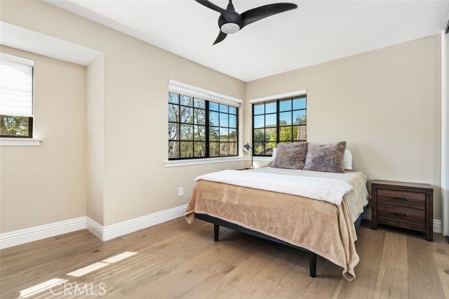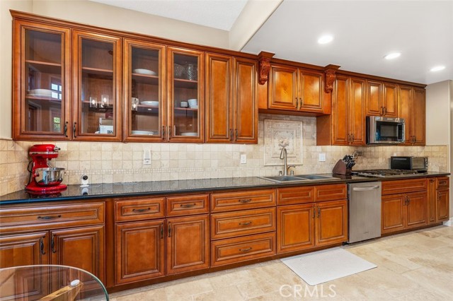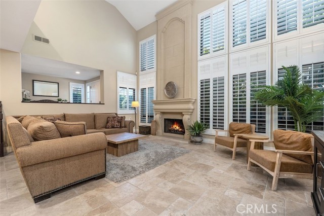 Beautifully upgraded North Ranch townhome that lives like a single-family home, featuring soaring ceilings and an open, spacious layout. The home offers a large living room, separate family room, and an eat-in kitchen with breakfast nook, creating a seamless flow ideal for both everyday living and entertaining. Both the living room and family room feature fireplaces, adding warmth and charm throughout. This 3-bedroom home includes a stunning primary suite with its own fireplace and a spa-like, upgraded bathroom. Recent improvements include fresh interior paint throughout (walls, trim, and stair railings), all new light fixtures, and brand new engineered white oak flooring upstairs. The home is thoughtfully enhanced with custom built-in closets, additional hallway cabinetry with stone countertops and two linen closets, and a custom wet bar with solid stone counters and limestone backsplash. The secondary bathroom has been updated with a new vanity, lighting, mirrors, and fixtures, and the powder room has been fully remodeled. Additional upgrades include improved laundry storage and new landscaping in much of the backyard. The private outdoor space is a true highlight, featuring a pool and dedicated BBQ area, perfect for relaxing or entertaining. Ideally located close to the community pool and clubhouse, this home is situated in the prestigious North Ranch neighborhood near the golf course. Offering exceptional privacy, the home shares only a minimal portion of one wall with a neighboring property. A rare opportunity to own a highly upgraded home with exceptional indoor-outdoor living.