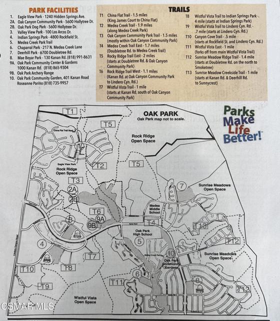 This gorgeous detached single home has been lovingly maintained and upgraded by its original owners who spent over $200,000 in recent updates! The sparkling kitchen features a 2021 remodel which includes upgraded appliances, gorgeous cabinetry, updated lighting and shining granite countertops. The breakfast bar seamlessly connects the kitchen to the dining room and contributes to the openness of the floor plan. The ceilings are high throughout and the home has a very spacious feel to it. The dining room opens to the living room which features a fabulous fireplace and front picture window. The newer front door is a statement all it's own and lends to the clean lofty vibe of the entire interior. The primary bedroom and updated attached bath are conveniently located on the first floor. The first floor hall features beautiful built in cabinetry, a laundry area and attached two car garage. The second level features two bedrooms, and two more updated bathrooms, one bedroom is ensuite. There is even an additional bedroom on the top (third) floor! This energy efficient house is ready for you to move right in - newer vinyl windows, a newer gas furnace and a/c unit (2023) as well as a new garage door (2024), newly insulated attic and insulated first floor walls are all designed and installed to keep energy costs down! The carpeting on the stairs and in the bedrooms is from 2025. This stunner is at the end (second to last house) of a flat, quiet cul de sac street. No houses behind it and plenty of cul de sac parking for your guests! The two sets of (newer) double door sliders open to your own private backyard oasis featuring a grassy area as well as a fire pit and a large patio area for entertaining and backyard dining. With no neighbors behind you, nature and all it's splendor are right outside your backdoor! The Country Meadows community includes a lovely pool and spa. The house is approximately one block to the closest (of many) hiking trails. Deerhill Park is right down the street and includes two playgrounds, basketball courts and 10 pickleball courts, baseball and soccer field. There is also a nearby dog park, splash pad and community center. Oak Park schools are known for their high ranking - 10/10 on Great Schools. 15 miles to Malibu Beaches. This home, location and community can't be beat!
