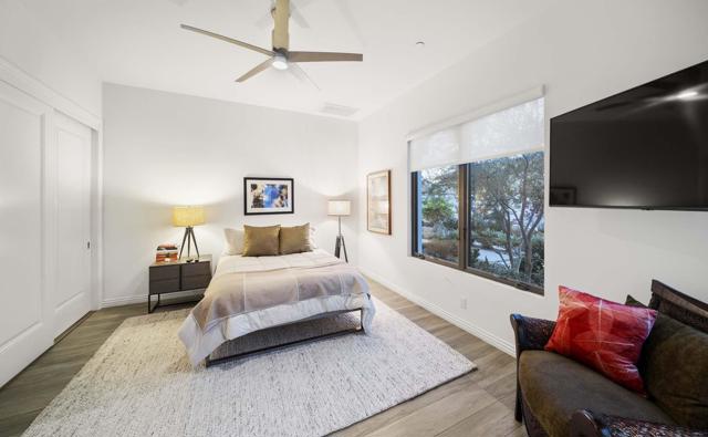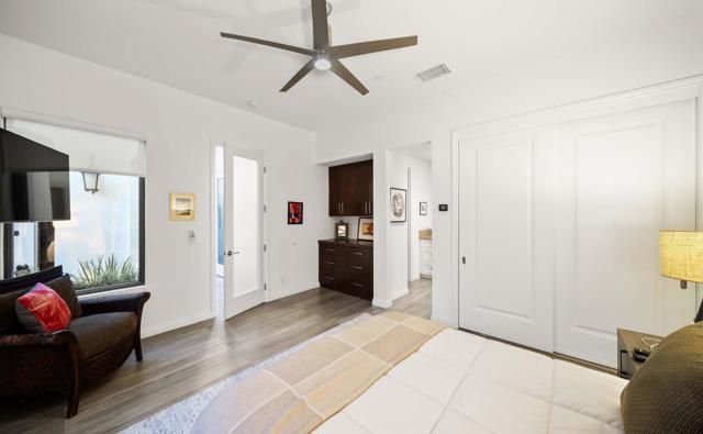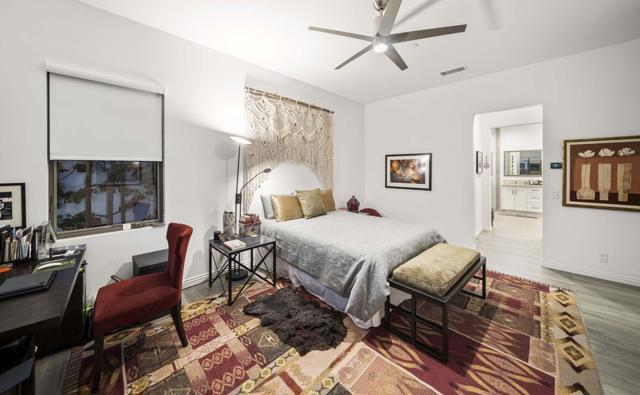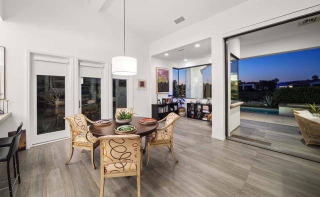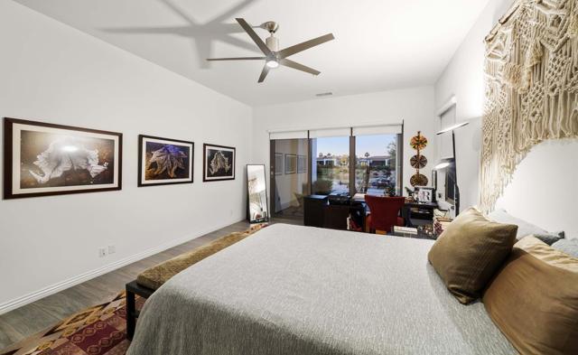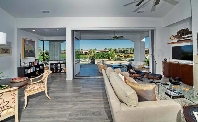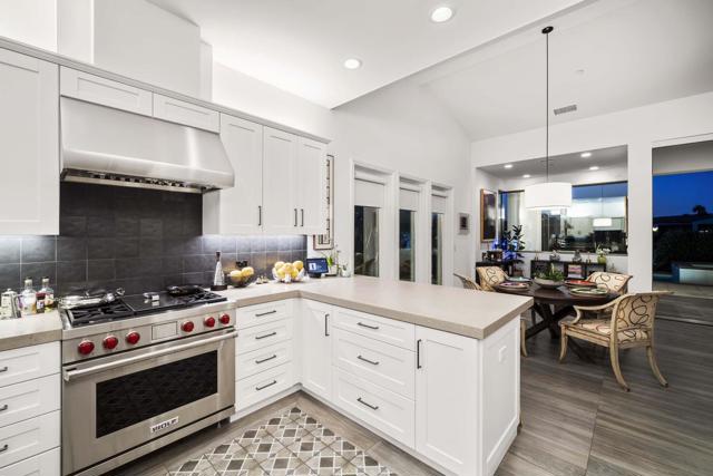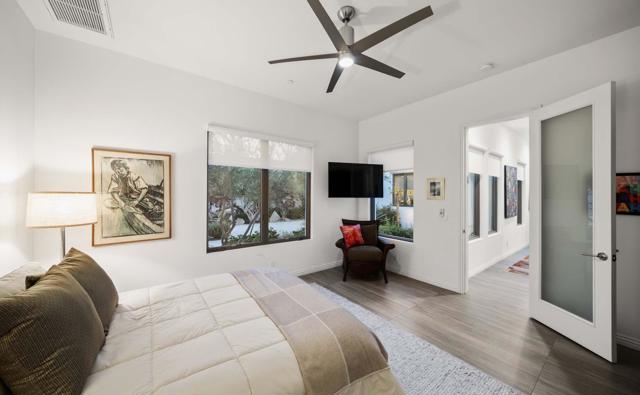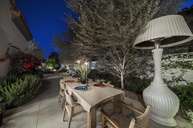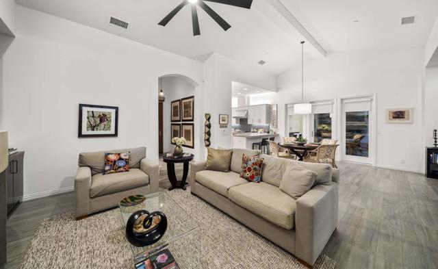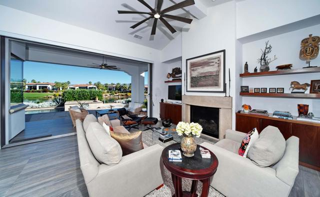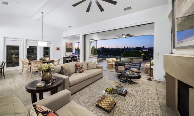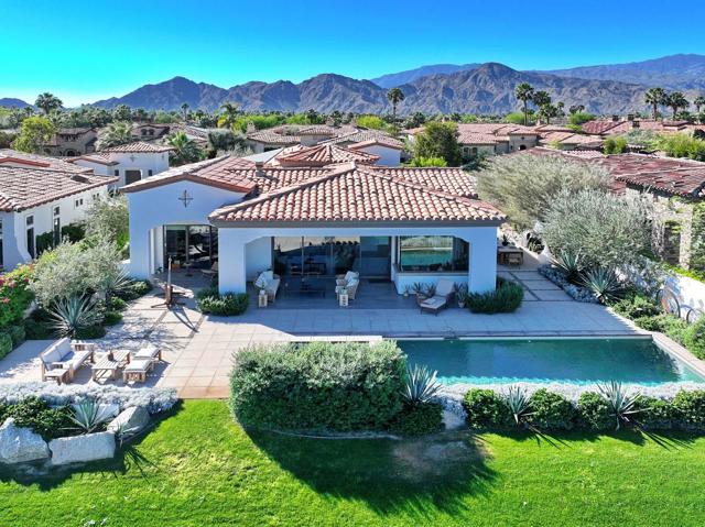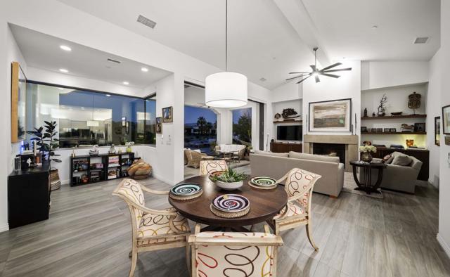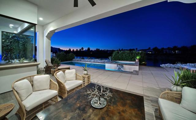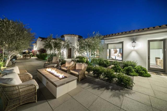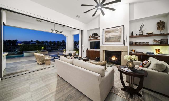 This newer-built, contemporary Plan 502 at Toscana Country Club is ideally positioned on an oversized Amalfi homesite along the 7th hole of the North Course, offering tranquil lake views and a beautifully upgraded landscape that creates a true desert oasis. Designed for effortless indoor-outdoor living, the home features expansive pocketing sliders that open to the outdoor spaces, along with a light-filled layout and refined modern finishes throughout. Owned solar adds to the home's efficiency and value.The spacious great room seamlessly connects the living, dining, and kitchen areas, highlighted by a striking fireplace and an open-concept design perfect for entertaining. The gourmet kitchen is thoughtfully appointed with ample cabinetry, generous counter space, a large island with breakfast bar seating, and premium Wolf and Sub-Zero appliances. The primary suite offers a peaceful retreat with a spa-inspired bath featuring a walk-in shower and a soaking tub. Guests are comfortably accommodated in the main home guest room with en-suite bath or the private guest house with its own courtyard entrance--ideal for hosting family and friends in style.