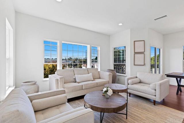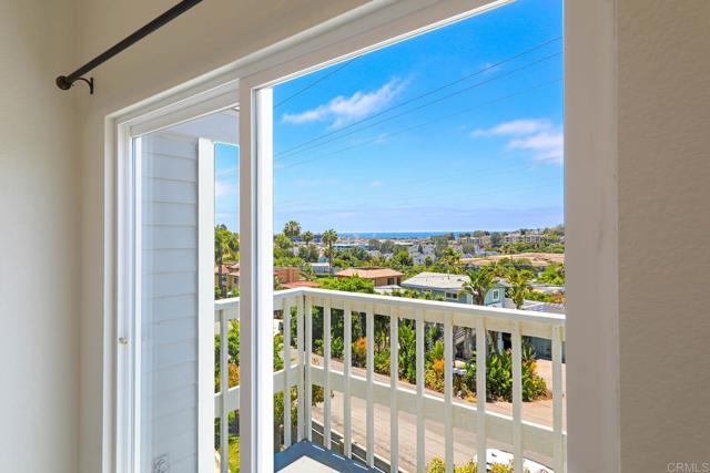 Remodeled beach townhome located west of I-5 in Solana Beach. This spacious, bright, and functional 3-story end-unit is tucked into the corner of a charming 12-unit gated community, offering exceptional privacy, beautiful west-facing windows, and ocean views from multiple areas of the home. The kitchen features white wood cabinetry, quartz countertops, and matching JennAir appliances, including a built-in refrigerator. It opens seamlessly to a nicely sized dining area and a large living room, creating an ideal layout for both everyday living and entertaining. Engineered wood flooring runs throughout the main level, while abundant windows fill the home with natural light. The interior has been freshly painted throughout, and custom window treatments are currently being installed. A convenient powder room is also located on the main floor for guests. Upstairs, you’ll find both bedrooms, a convenient office nook with a gorgeous coastal view, and a full-size washer and dryer. Both upstairs bathrooms have been beautifully remodeled, and the primary bedroom balcony offers the perfect place to relax and unwind. Additional highlights include brand new central air conditioning, plentiful storage, an oversized 2-car garage, and an additional storage room. Located in the gated community of Del Mar Downs, this unique townhome is ideally situated near some of the area’s best beaches, excellent schools, and top-rated restaurants. The Del Mar Racetrack, Cedros Design District, and the Village of Del Mar are all just down the street, giving you the best of both Solana Beach and Del Mar right at your fingertips.