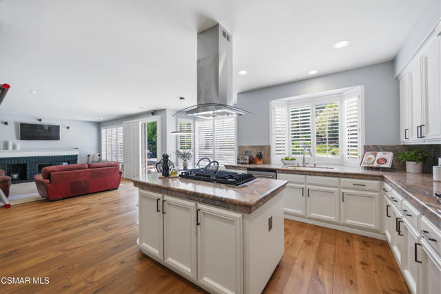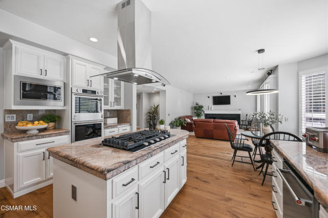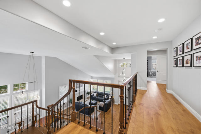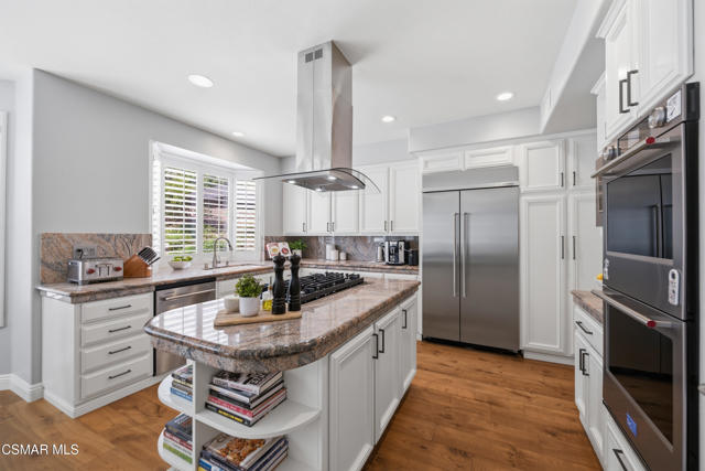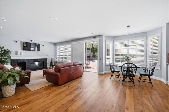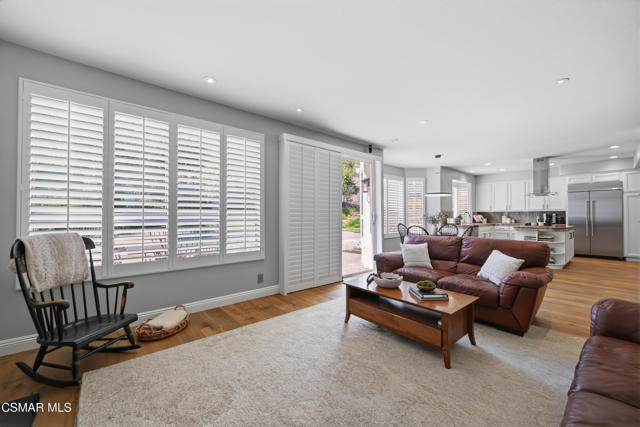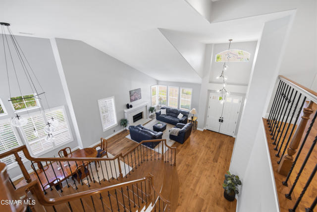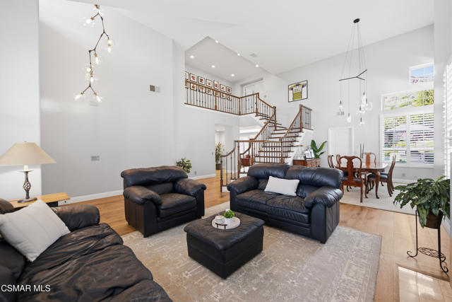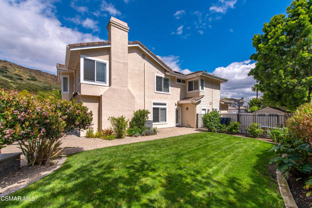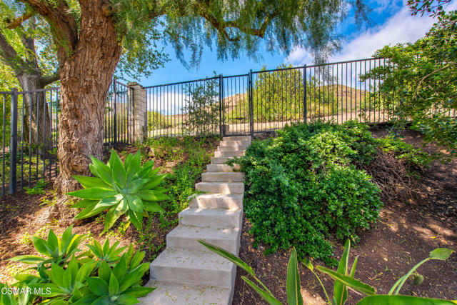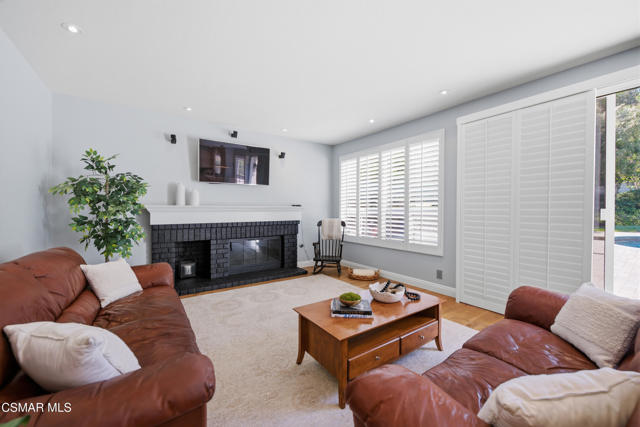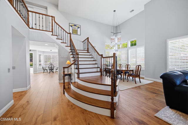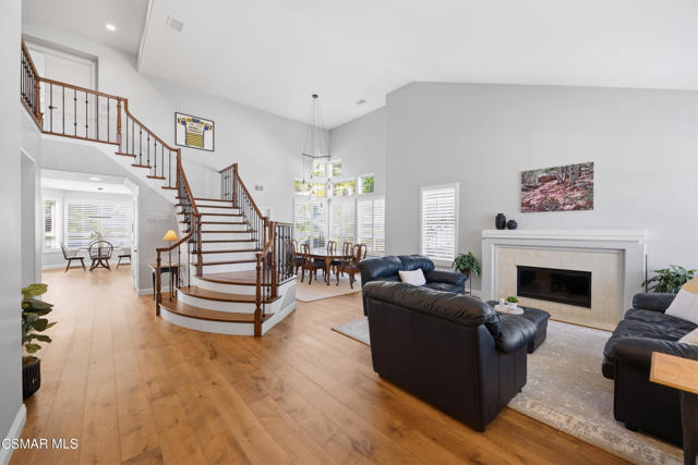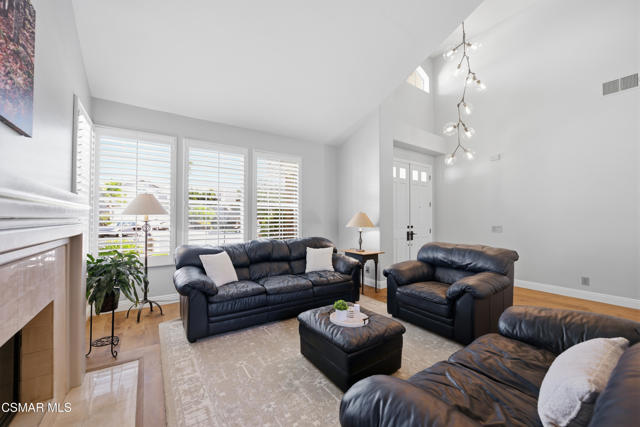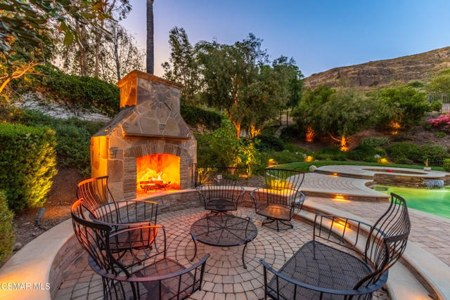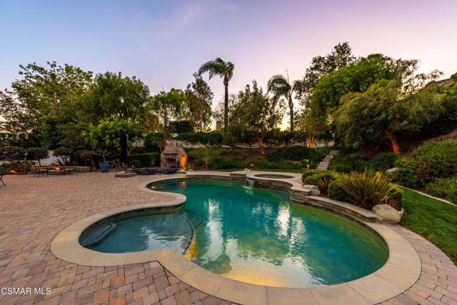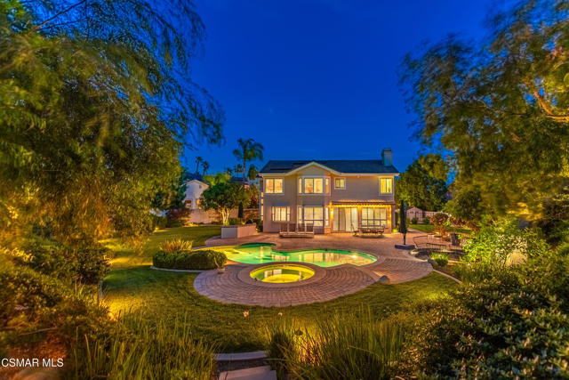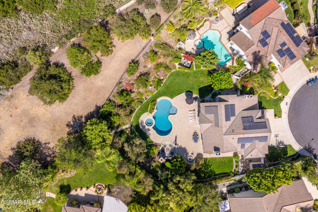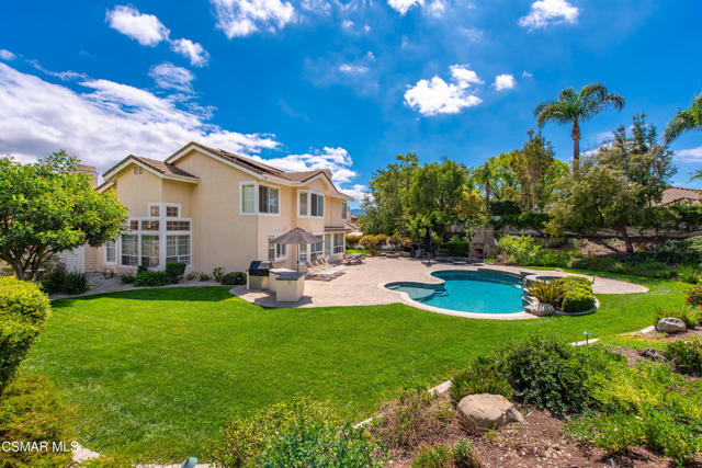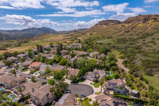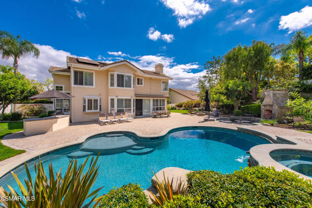 Now available in the highly sought-after Wildwood neighborhood of Thousand Oaks, this unique home is ideally located on a quiet cul-de-sac and set on a large pie-shaped lot with incredible privacy and sweeping views of the surrounding landscape. Designed for both comfortable living and exceptional entertaining, the backyard is a true retreat featuring a pool and spa, grassy area, BBQ space, outdoor dining area, built-in fireplace with seating, lounge areas, firepit, side yard, and more--all surrounded by lush landscaping and mature trees. Inside, the home offers a spacious and functional layout. The living room welcomes you with high ceilings and an abundance of natural light, flowing into a formal dining room. The kitchen is well-appointed with white cabinetry, stainless steel appliances, and a center island, opening to the family room with a fireplace and direct access to the backyard for seamless indoor-outdoor living. The main level also includes a versatile bedroom or office, a full bathroom, and a laundry room with side yard access and entry to the three-car garage featuring epoxied floors. Upstairs, a grand staircase leads to the expansive primary suite with high ceilings and a well-designed ensuite bathroom complete with dual vanity sinks, a large shower, separate soaking tub, and a spacious closet with dual access. Down the hall are two additional bedrooms and a full bathroom with dual vanities. An additional upstairs bonus space with high ceilings offers flexibility as a playroom, office, media room, or potential fourth bedroom. Additional highlights include solar panels, offering energy efficiency and long-term savings. Located just moments from Wildwood hiking trails and Wildwood schools, this is a rare opportunity to own a beautifully appointed home in one of Thousand Oaks' most desirable communities.