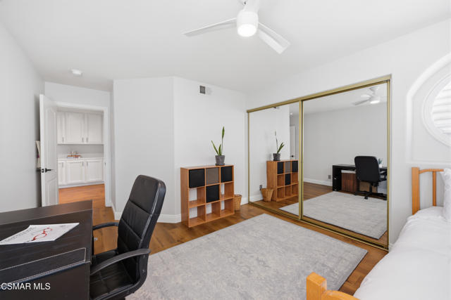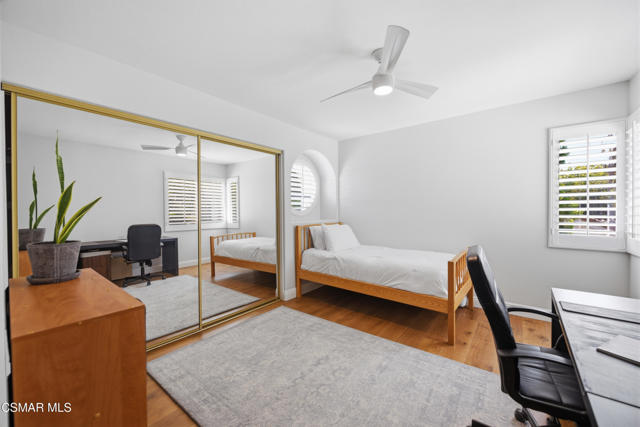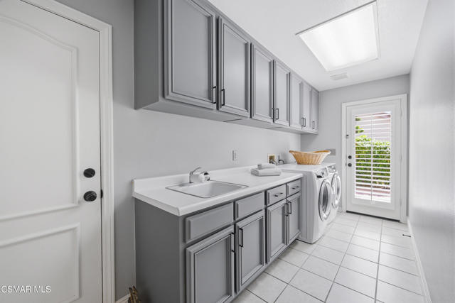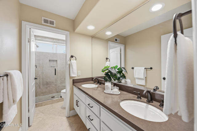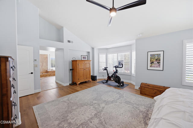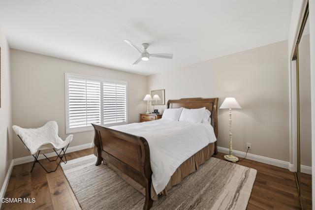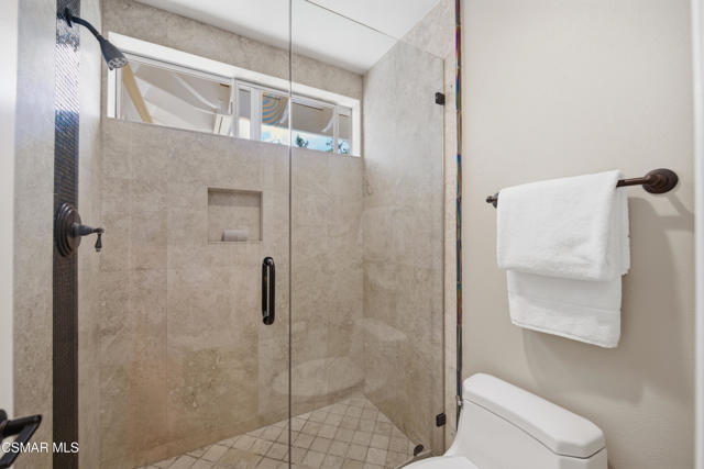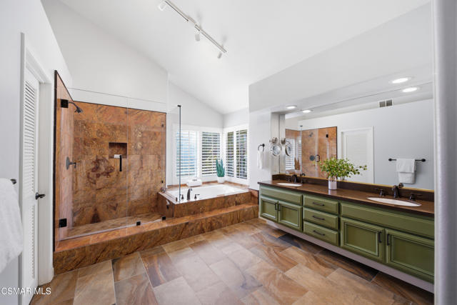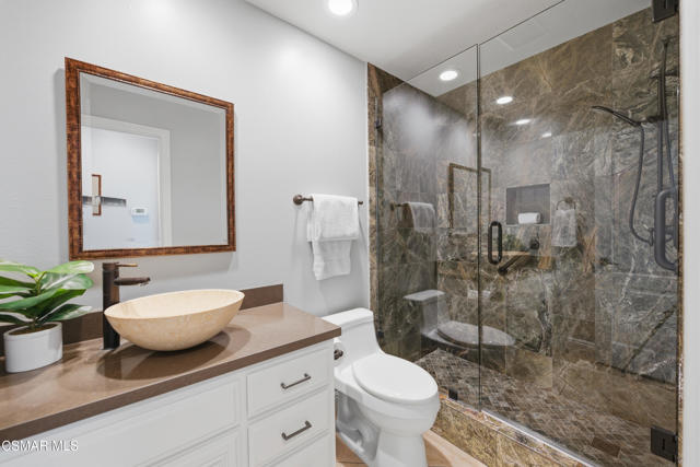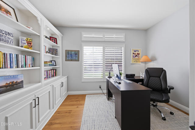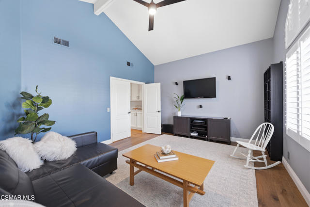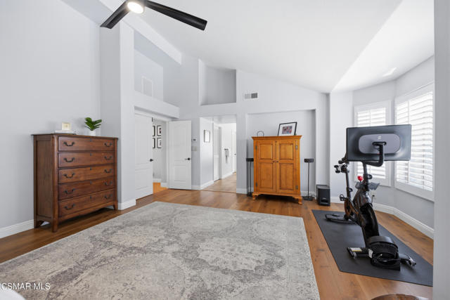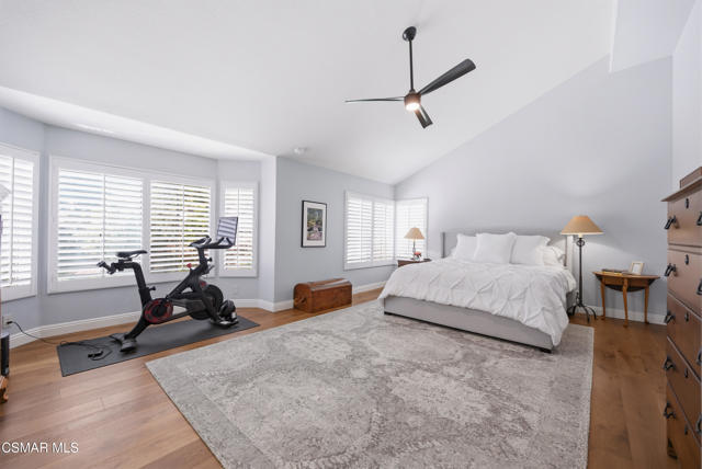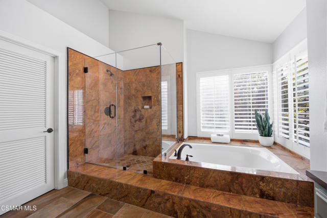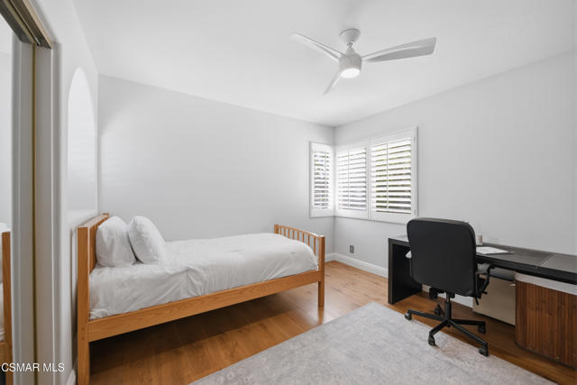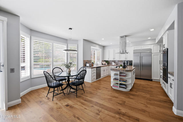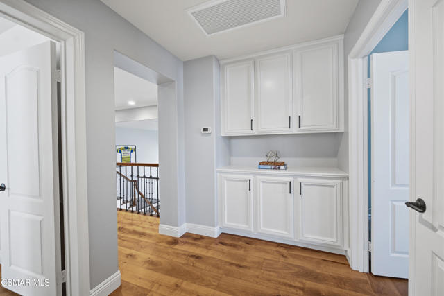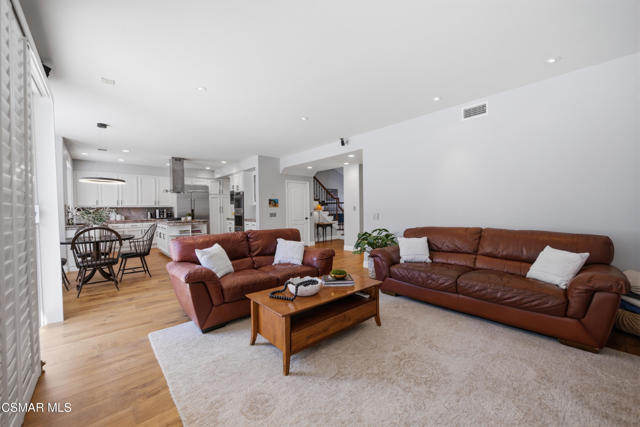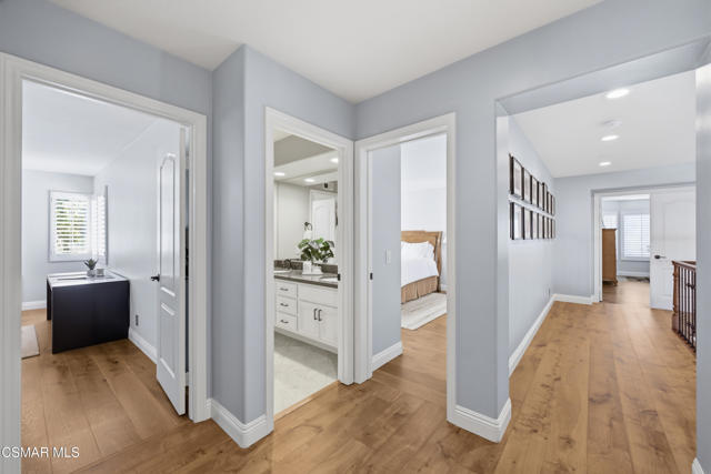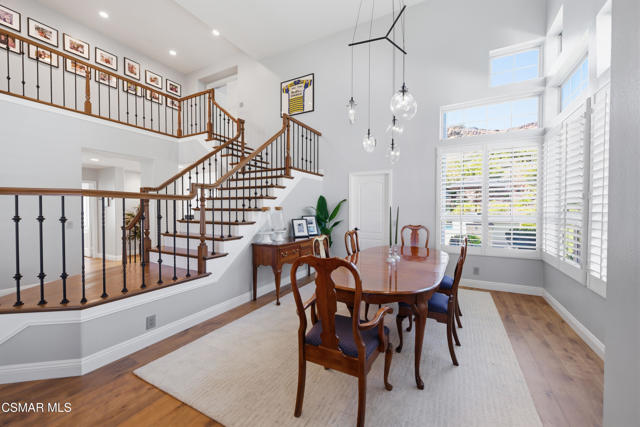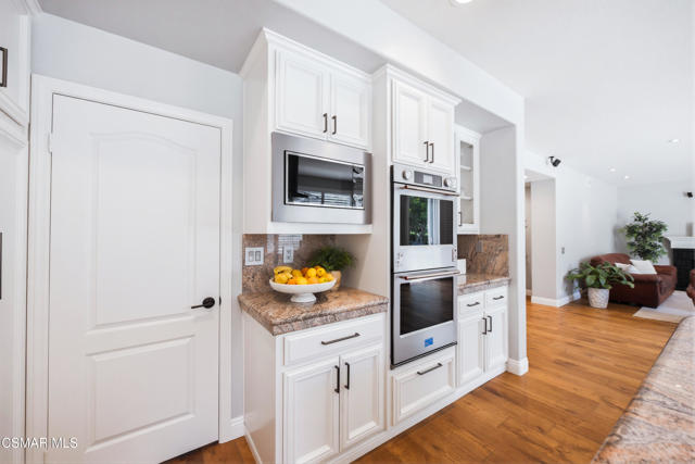 Now available in the highly sought-after Wildwood neighborhood of Thousand Oaks, this unique home is ideally located on a quiet cul-de-sac and set on a large pie-shaped lot with incredible privacy and sweeping views of the surrounding landscape. Designed for both comfortable living and exceptional entertaining, the backyard is a true retreat featuring a pool and spa, grassy area, BBQ space, outdoor dining area, built-in fireplace with seating, lounge areas, firepit, side yard, and more--all surrounded by lush landscaping and mature trees. Inside, the home offers a spacious and functional layout. The living room welcomes you with high ceilings and an abundance of natural light, flowing into a formal dining room. The kitchen is well-appointed with white cabinetry, stainless steel appliances, and a center island, opening to the family room with a fireplace and direct access to the backyard for seamless indoor-outdoor living. The main level also includes a versatile bedroom or office, a full bathroom, and a laundry room with side yard access and entry to the three-car garage featuring epoxied floors. Upstairs, a grand staircase leads to the expansive primary suite with high ceilings and a well-designed ensuite bathroom complete with dual vanity sinks, a large shower, separate soaking tub, and a spacious closet with dual access. Down the hall are two additional bedrooms and a full bathroom with dual vanities. An additional upstairs bonus space with high ceilings offers flexibility as a playroom, office, media room, or potential fourth bedroom. Additional highlights include solar panels, offering energy efficiency and long-term savings. Located just moments from Wildwood hiking trails and Wildwood schools, this is a rare opportunity to own a beautifully appointed home in one of Thousand Oaks' most desirable communities.