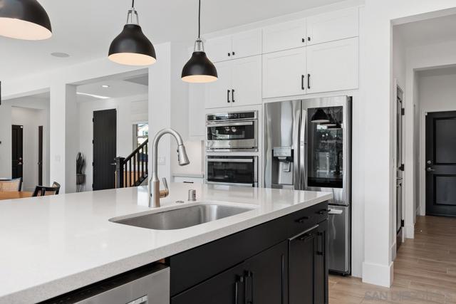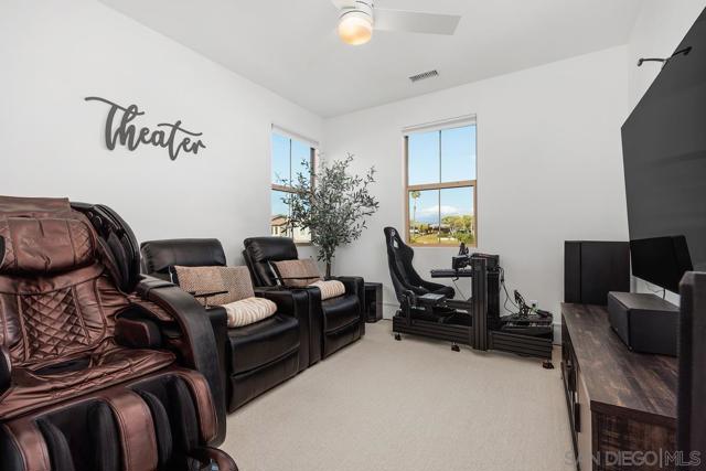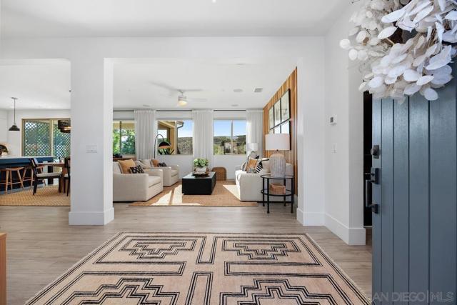 Exuding sophistication and model-home perfection, this exceptional residence in the coveted S.L. Rey community of Bonsall offers refined living at its finest. Thoughtfully designed, the home features 4 spacious bedrooms upstairs and a versatile main-level bonus room ideal for a private office or guest retreat. At the heart of the home, the chef-inspired kitchen showcases quartz countertops, an expansive island, soft-close cabinetry, a walk-in pantry, and a butler’s pantry with custom built-ins for seamless organization. Premium upgrades include a hands-free faucet, newer double oven and microwave, and stylish pendent lights. The living space is enhanced with surround sound and a designer feature slat wall, while upstairs offers plush, like-new carpeting, a statement staircase with stunning designer chandelier suspended from the second story ceiling, upgraded ceiling fans, and smart motorized blinds. Additional high-end features include 7-inch baseboards, smart lighting controls, A/C, OWNED solar, and a tankless water heater for optimal efficiency and comfort. Step into a beautifully curated outdoor retreat featuring low-maintenance turf, mature fruit trees, and tranquil greenbelt views-an ideal setting for both relaxation and entertaining.The epoxy-finished 3-car garage, along with rain gutters and French drains, reflects the home’s attention to detail. Enjoy close proximity to top-rated schools and over 100 acres of scenic walking, biking, and equestrian trails—all with no Mello-Roos. A rare opportunity to own a truly turnkey home where luxury, comfort, and lifestyle meet