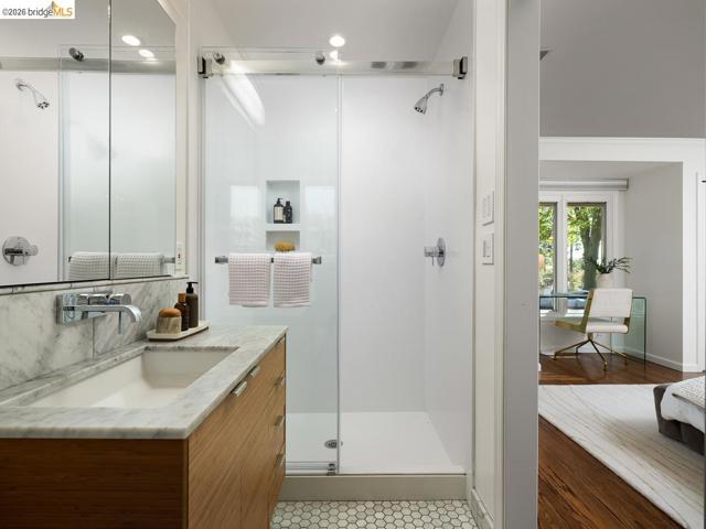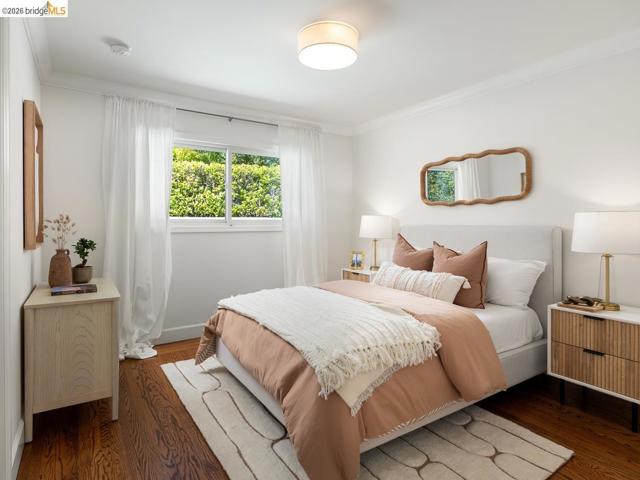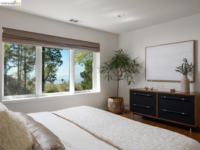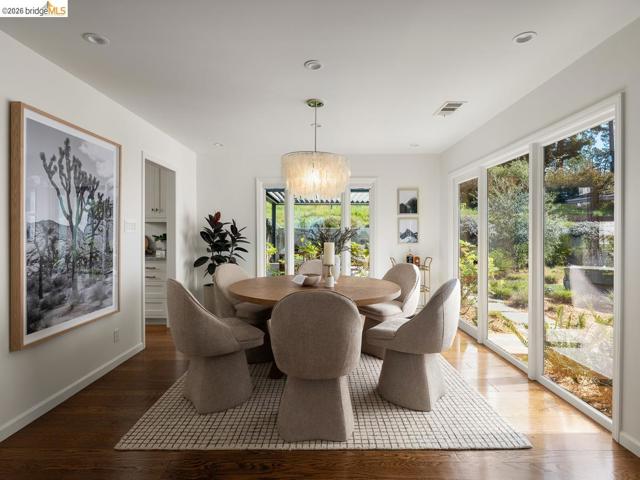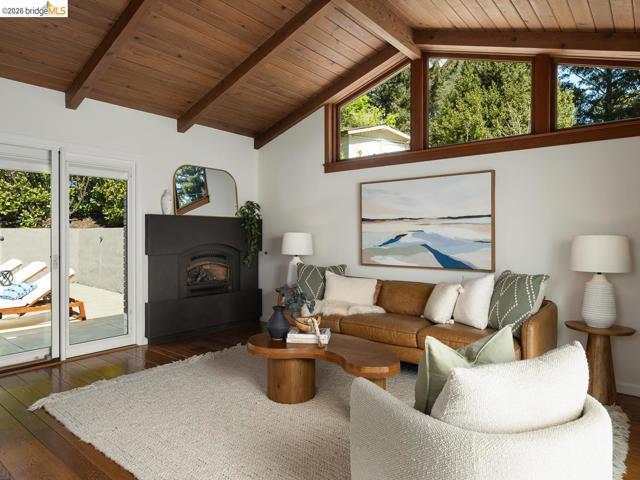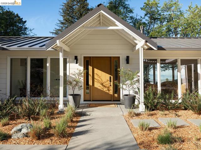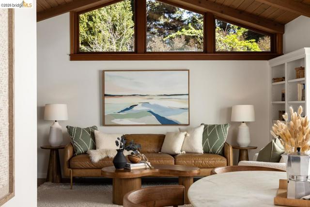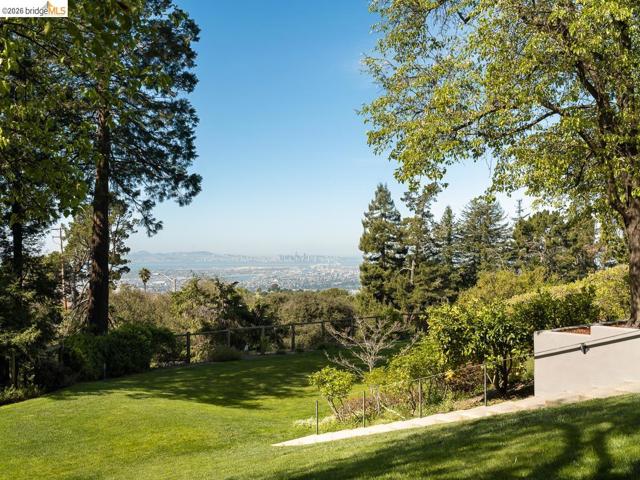 Set on approximately 1.1 acres in the coveted Hillcrest Estates enclave of the Oakland Hills, Skyland offers a rare blend of space, privacy, and natural beauty. Originally built in 1948 and thoughtfully reimagined in 2021, this single-level home balances timeless architecture with modern living. Walls of glass fill the home with natural light while framing views of redwoods, curated grounds, and the Bay. The well-designed layout includes 4 bedrooms, 4.5 baths, highlighted by a luxurious primary suite with a spa-like bath, steam shower, and soaking tub, along with a private guest suite. A dedicated executive office and separate studio/gym support work, creativity, and wellness. Designed for both everyday living and entertaining featuring a heated pool with Bay views, a pergola lounge with integrated lighting and sound, expansive patios, and a rare level lawn surrounded by mature landscaping originally envisioned by Napa Valley designer Jack Chandler. The kitchen offers marble countertops, Wolf and Sub-Zero appliances, abundant storage, and a walk-through pantry. Solar, a whole-home generator, enterprise-grade networking, and advanced air filtration complete the home; single-level living on over an acre with Bay views, an incredibly rare combination seldom found in the Bay Area.