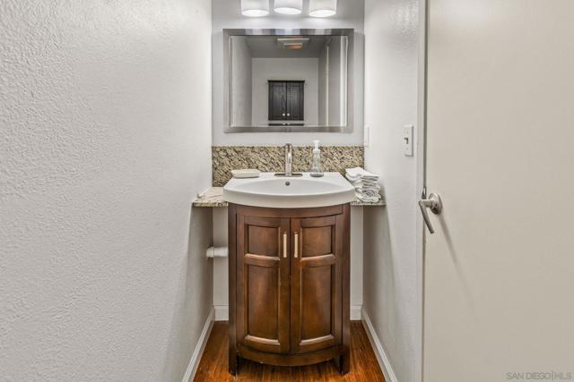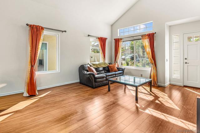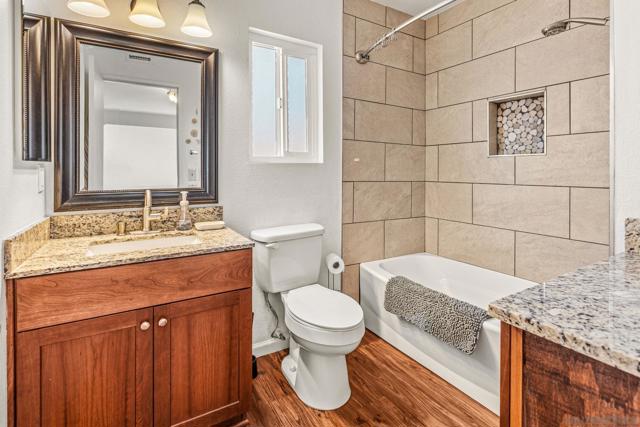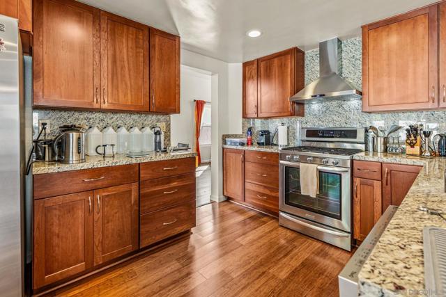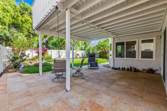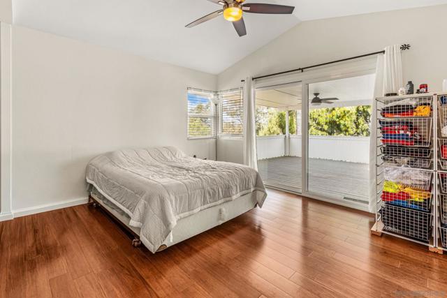 Expanded kitchen, fully owned solar, and private yard. Vaulted ceilings and natural light hit the moment you walk in. Remodeled and expanded kitchen with added dining space, extra pantry storage, granite counters, stainless steel appliances, and a breakfast bar overlooking the yard. Family room with fireplace opens straight to a covered patio. Upstairs, the primary suite delivers a private deck with pool and hill views plus a fully remodeled bath with dual sinks and a walk-in shower. Two additional bedrooms, an updated hall bath, and added hallway cabinetry for storage. Wood floors throughout. Turnkey upgrades include 7.5KW owned solar, AC, dual-pane windows, tankless RO system, newer washer/dryer, and fresh exterior paint. Private backyard backing to greenbelt. Located in Lakeview Estates with pool, spa, and park access, minutes to Guajome Lake and bike trails, and the beach.