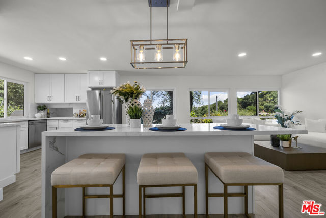 Views! Views! Views! Perched above it all on a quiet cul-de-sac, 3453 Green Vista Dr is a single-level contemporary retreat that captures sweeping mountain and valley views from nearly every angle. This is a rare opportunity to own a home that truly feels like a private escape yet remains moments from the best of the Westside. Designed for both effortless living and elevated entertaining, the home welcomes you with expansive open-concept spaces filled with natural light. The chef's kitchen is a true centerpiece, featuring a stunning Calcutta white waterfall island, custom cabinetry, and sleek stainless steel appliances perfectly blending style and function. The home features three generously sized bedrooms, highlighted by a luxurious primary suite complete with walk-in closets and a spa-inspired bath with a soaking tub, dual vanities, and a glass-enclosed shower. A dedicated home office provides the ideal space for remote work or creative pursuits.Step outside and experience your own private resort. Lush landscaping, cascading hillside waterfalls, and a stunning entertainer's patio set the stage for unforgettable gatherings complete with a built-in BBQ kitchen, bar, and panoramic views that make every sunset feel like a moment.Located within the sought-after Lanai Road Elementary district and close to top-rated schools, including Gaspar De Portola Middle School and High Tech LA, this home offers both lifestyle and location in one exceptional package. This is more than a home, it's a daily escape.