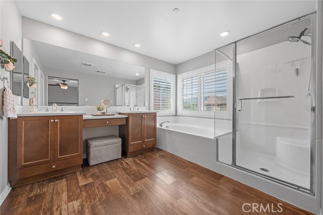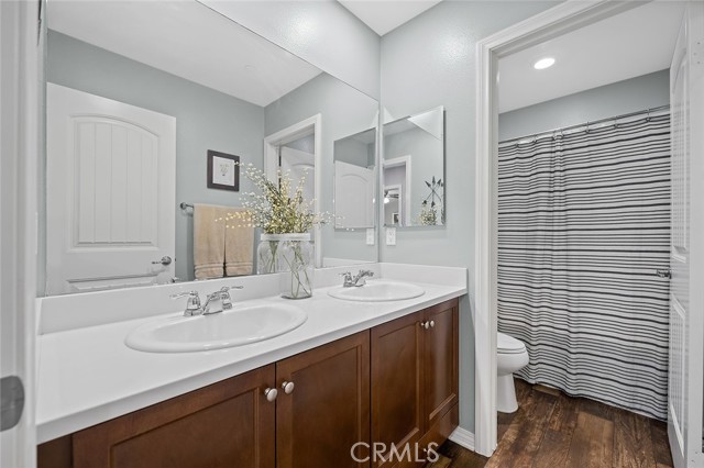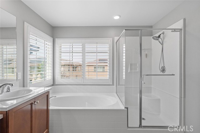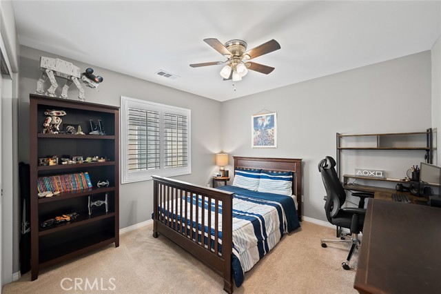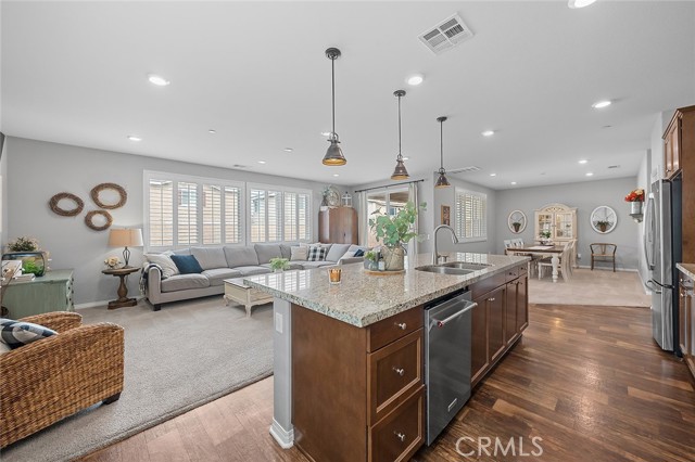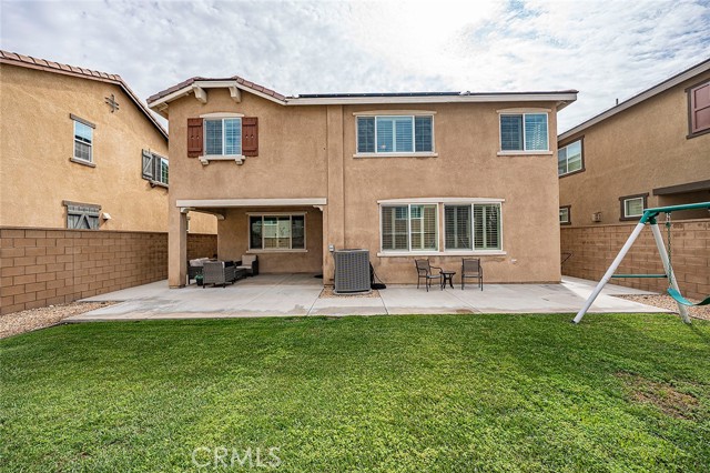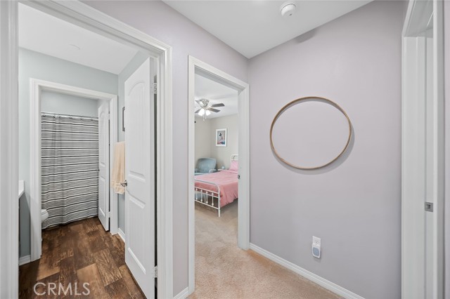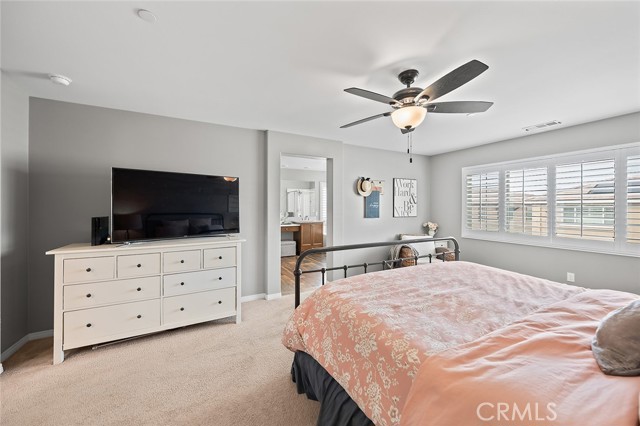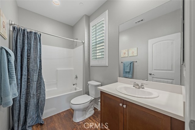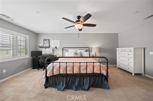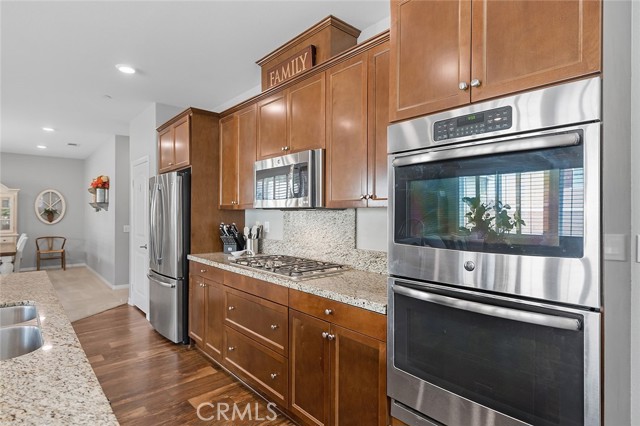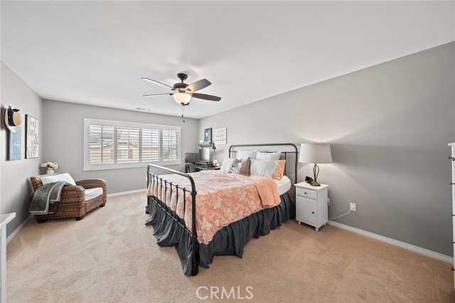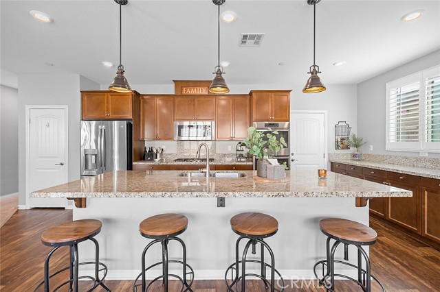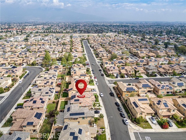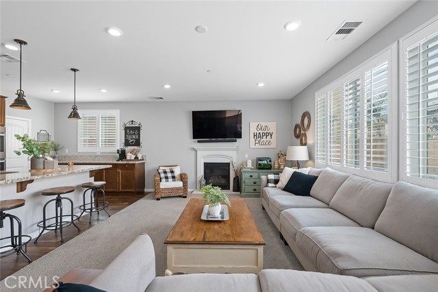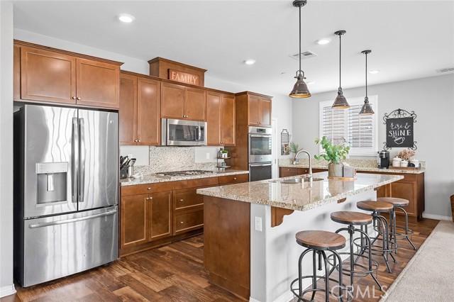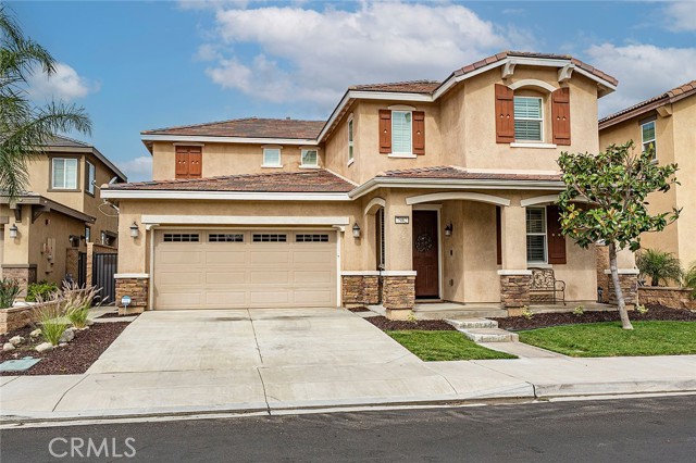 Welcome home to this beautifully maintained 4-bed, 3.5-bath residence in Fontana's desirable Sultana Neighborhood. Built in 2016, this 2,628 sq ft two-story home offers an open-concept layout with hardwood-style flooring, recessed lighting, and plantation shutters throughout. The chef's kitchen features granite countertops, a large island with bar seating, double oven, stainless steel appliances, and a walk-in pantry, all open to the spacious family room. A main-floor bedroom and full bath provide ideal guest or multi-gen accommodations. Upstairs, you'll find a generous loft, a primary suite with soaking tub, separate shower, and dual vanities, plus two additional bedrooms sharing a dual-sink bath. The covered back patio overlooks a private yard, perfect for entertaining. Solar panels installed. HOA amenities include pool, kids' pool, playground, clubhouse, and BBQ areas. 2-car attached garage. This home offers the perfect combination of space, style, and family-friendly living in one of Fontana's most welcoming communities.
