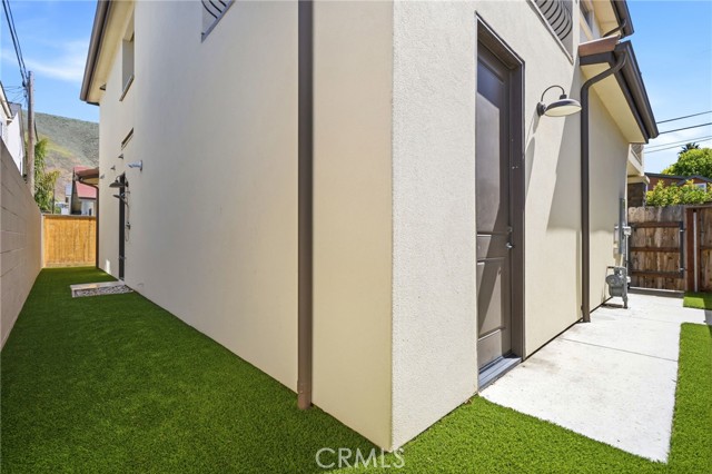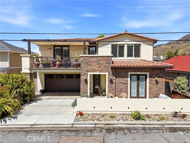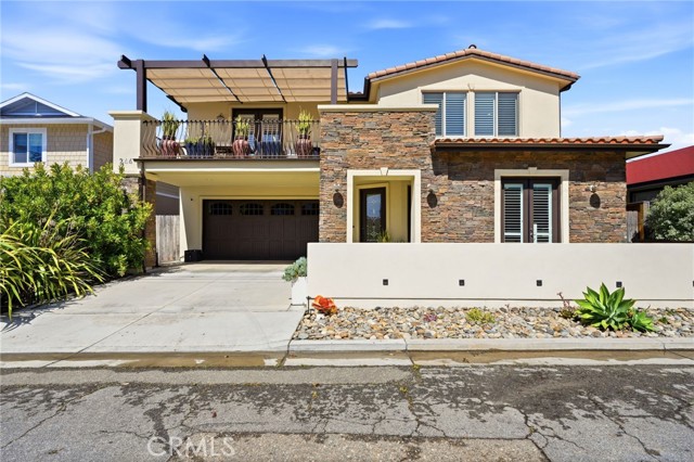 Welcome to coastal luxury in the heart of Pismo Beach, just moments from the water. This stunning modern Spanish-style residence blends timeless architecture with refined coastal living, featuring a striking rock exterior and a grand entrance that immediately sets the tone. As you enter, an elegant staircase leads you to the main living level, where an expansive open-concept layout creates the perfect space for entertaining. The beautifully designed kitchen flows seamlessly into the spacious living room, opening out to a private balcony with an ocean view—an ideal setting for morning coffee, sunset gatherings, or enjoying the fresh sea air. For sunny coastal afternoons, the balcony is equipped with retractable awning shades, allowing you to enjoy the outdoor space in comfort while taking in the ocean view. The primary suite also offers direct balcony access, allowing you to unwind each evening with the soothing ocean breeze. Just off the primary bathroom, a private patio retreat provides an additional space to relax in peace. Downstairs, you’ll find two additional bedrooms, thoughtfully designed for comfort and privacy. One functions as a junior suite with its own full shower bathroom, creating a second primary-style space perfect for guests or multigenerational living. The additional bedroom enjoys easy access to its own nearby bathroom. A convenient office nook on the lower level offers the perfect work-from-home or study space. Outside, the home continues to impress with beautifully designed, low-maintenance outdoor spaces. The front yard features a charming putting green and inviting patio area ideal for entertaining with a newly added half stucco privacy wall that enhances the front exterior, adding both style and seclusion. While the backyard is finished with premium artificial turf for easy upkeep and year-round beauty and an outdoor shower to use after a long sandy day at the beach. This is the perfect blend of elegance, comfort, and coastal lifestyle in one of the Central Coast’s most desirable beach communities.