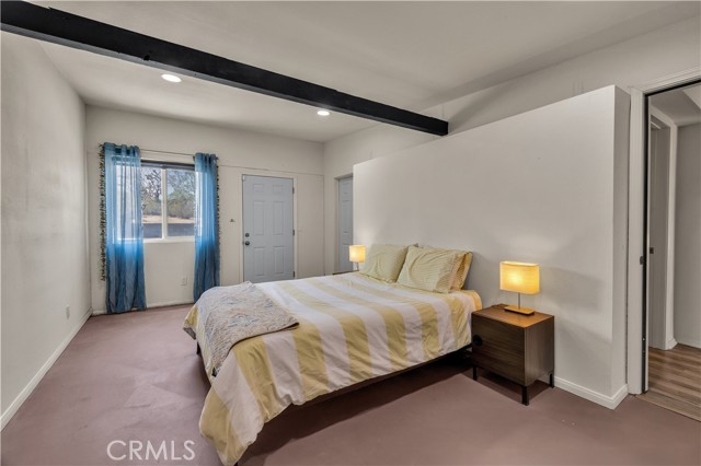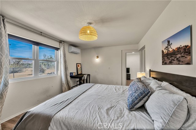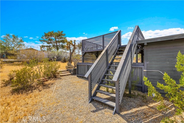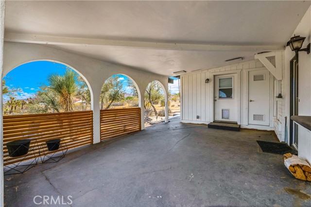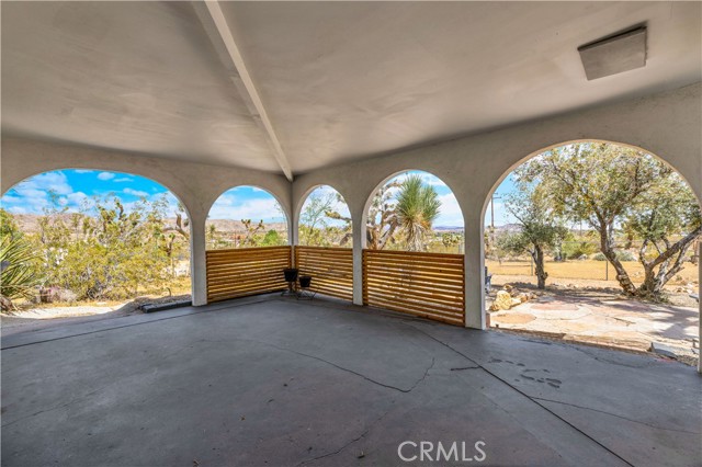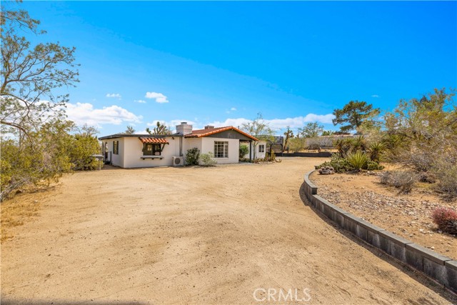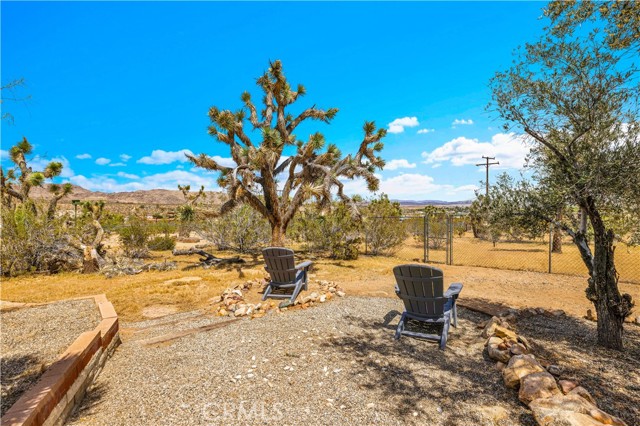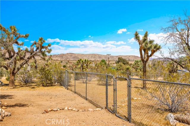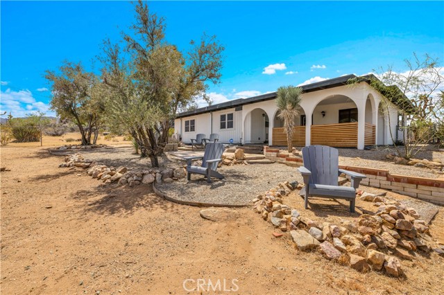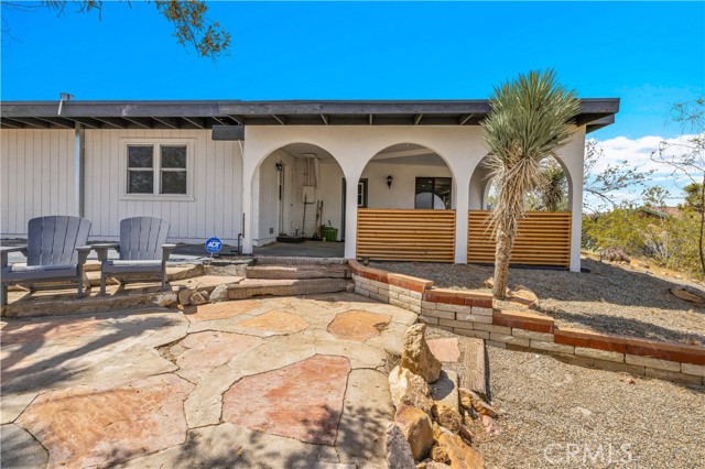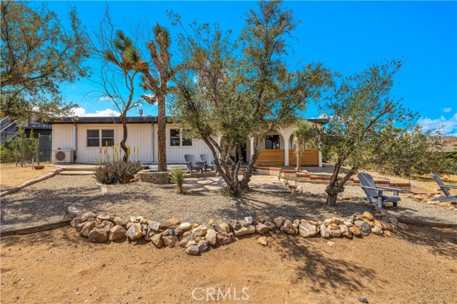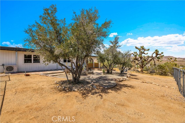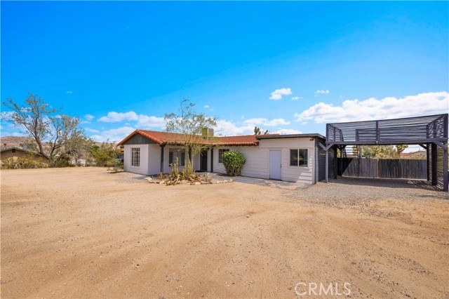 Wonderful Joshua Tree home full of character on a fully fenced 1.25-acre lot and on a paved road. This unique property blends natural desert beauty with thoughtful landscaping, creating a setting that feels perfectly integrated with its surroundings. As you arrive, you’ll appreciate the long driveway that runs through the property to the carport, offering plenty of space and functionality. The carport also serves as a dual-purpose observation deck, providing a great vantage point to take in the surrounding desert views. Step inside and you’ll immediately notice the home’s distinctive character, featuring masonry walls, tall vaulted ceilings, and an abundance of windows that fill the space with natural light. The living area includes a fireplace with a wood-burning stove insert, adding warmth and charm. The kitchen is exceptionally large, offering an impressive amount of cabinet storage, counter space, and quartz countertops. There is ample room for dining, and the view from the kitchen sink looks out to the backyard. Just beyond, the back patio is a standout feature, designed with large rounded archways that beautifully frame the natural desert landscape. All of the bedrooms are generously sized, and the home is equipped with mini-split systems throughout for efficient heating and cooling. The bathroom has been remodeled and features a large vanity with matching finishes to the kitchen along with a tile shower-tub combo. Outside, you’ll find multiple seating areas to relax and enjoy the peaceful surroundings, along with a cross-fenced section that is perfect for pets or added functionality. This is a rare opportunity to own a property that offers space, character, and a true connection to the Joshua Tree landscape.