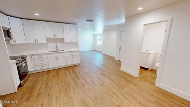 This beautiful 2+2 ADU features newer vinyl floors, recessed lighting, dual pane windows, central heat and air, new floors, a living room, a large open kitchen area, new cabinets, quartz counters, stainless steel appliances, small laundry room washer & dryer included, hall bathroom featuring newer vanities, quartz counters, tile accents, one bathroom with soaking tub and the master bedroom with its private bath with newer vanity, quartz counter, and tile shower, good size second bedroom with closet. This unit has a private patio, central heat, and air. Washer, dryer & refrigerator included. Water & trash also included!