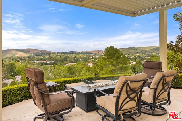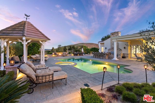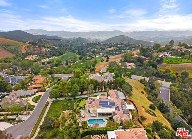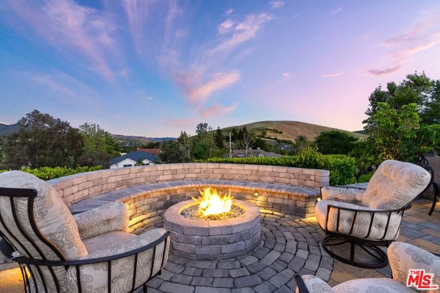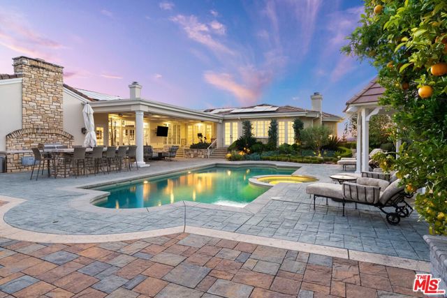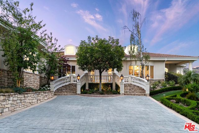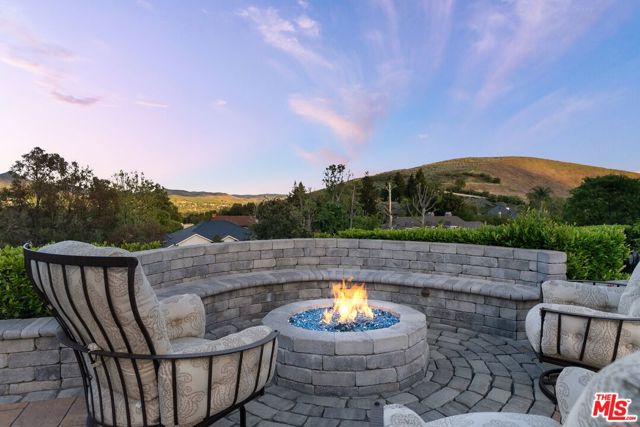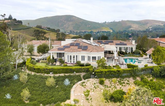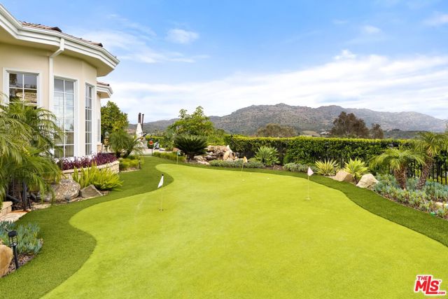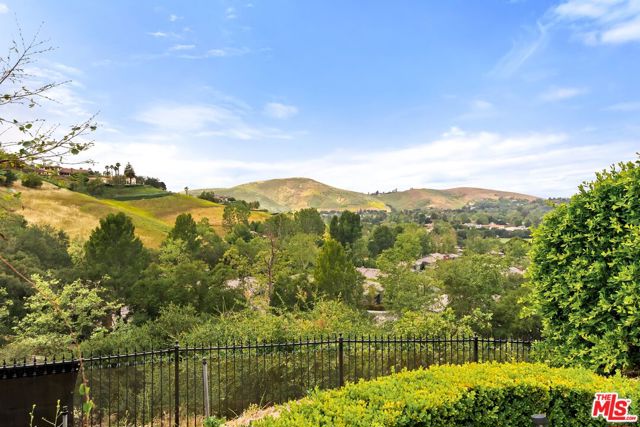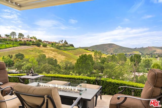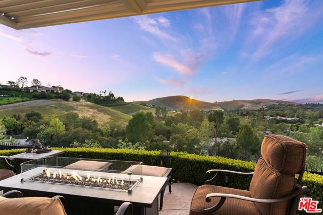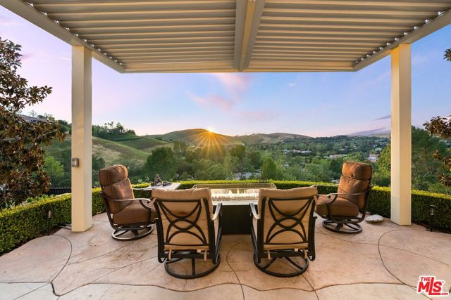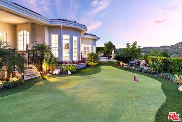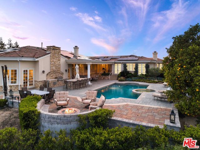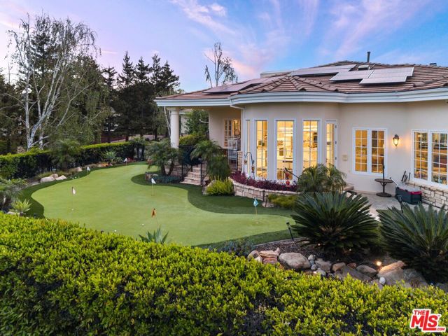 North Ranch Private Promontory. Single level. Thoughtfully reimagined. Tucked behind it's own gates atop a rare 1.67-acre hilltop, this North Ranch estate sits high above the street, privately situated from its elevated vantage point, the residence captures both sunrise and sunset horizons, an everyday balance of seclusion and openness just moments from North Ranch Country Club. As you ascend the drive, the home reveals itself with quiet confidence. You pass the welcoming front entry and continue toward the west-facing garage, discreetly positioned to preserve both symmetry and privacy. Through the front door, a light-filled foyer opens the experience, formal living ahead, library/office to the left, detailed with rich wood bookcases, cabinetry and paneling, coffered ceiling and leaded glass. To the right, the formal dining room connects through a butler's pantry to the kitchen, designed for both beauty and function. The chef's kitchen anchors the home's entertaining spaces with Cristallo quartzite surfaces, four ovens, dual Sub-Zero refrigeration, and dual dishwashers. Flow continues effortlessly into the family room and a striking backlit bar, forming a cohesive gathering environment defined by texture, proportion, and light.The primary suite offers a calm retreat with a spa-inspired bath featuring a steam shower, soaking tub, and custom cabinetry. Secondary bedrooms extend along the private hall, each balancing comfort and openness with thoughtful separation from public spaces.Outdoors, the estate unfolds in scale and intention, expansive and multiple covered sitting areas create generous entertaining zones on both sunrise and sunset sides of the property. The landscape is layered for gathering and retreat, featuring generously sized pool and spa, built-in BBQ, flowing pond, 2 natural gas fire pits (sunrise side and sunset side), and an oversized putting and chipping green surrounded by mature greenery. Substantial infrastructure upgrades complete the property, including 107 owned solar panels, new roof, whole-home backup generator, extensive security systems, keypad access, and dual EV charging in the garage. Elevated. Private. Architectural. A single-level North Ranch estate reimagined for modern California living.