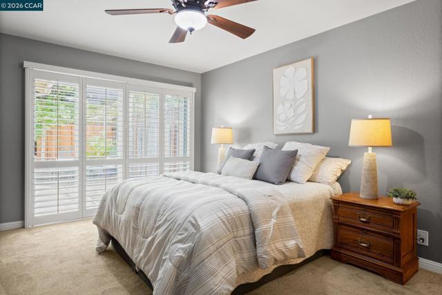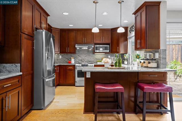 Single story duet in Rudgear Estates set toward the end of the street where the road meets open space, offering a quiet, tucked away setting. The living room features a fireplace & large picture window, while a separate dining area sits between the living room & kitchen, maintaining defined spaces with a natural flow. At the center of the home, the kitchen connects directly to the family room, creating a natural gathering space. The remodeled kitchen features shaker style cabinetry, stone countertops, stainless steel appliances, a gas range, peninsula seating & ample storage, with a skylight bringing in natural light. The family room opens to the backyard through sliding glass doors, creating an easy indoor outdoor connection. The primary suite offers direct backyard access, a walk in closet & an updated bath with a walk in shower. Two additional spacious bedrooms share the hall bath. The backyard offers privacy with paver patios, raised garden beds, mature landscaping & multiple areas for outdoor dining or relaxing. Ideally located near Rudgear Park, community pool, trails & top rated Walnut Creek schools, this home is minutes from Downtown Walnut Creek, Whole Foods, & Highway 680, with BART just 5 miles away.