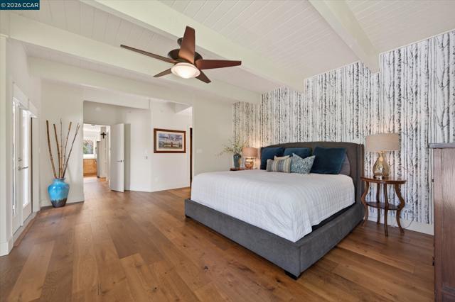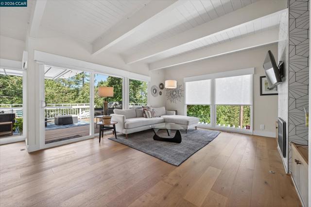 Cool mid-century style defines this 1,421 sq ft, 2-bedroom, 2-bathroom home (plus private office - not included in sq ft) tucked at the end of a quiet street, just moments from walking and biking paths to downtown. Thoughtfully designed to bring the outdoors in, the light filled living spaces are framed by walls of floor-to-ceiling windows that showcase picturesque views and create a strong connection to nature. The inviting living room and separate dining area, adjacent to the kitchen, offer an easy flow for everyday living and entertaining. Step outside to the spacious private deck, an ideal setting for relaxing and enjoying the serene surroundings. The primary suite is a true retreat, with windows that frame the natural landscape, a walk-in closet, and a spa like bathroom that completes the space. A dedicated office with its own private entry offers an ideal setup for working from home, tucked away from the bustle of daily life. Additional highlights include a fully owned 16-panel solar array and a dedicated 32-amp circuit car charger outlet in the garage This peaceful location also offers quick access to major freeways, making travel throughout the Bay Area easy while still enjoying a quiet residential setting.