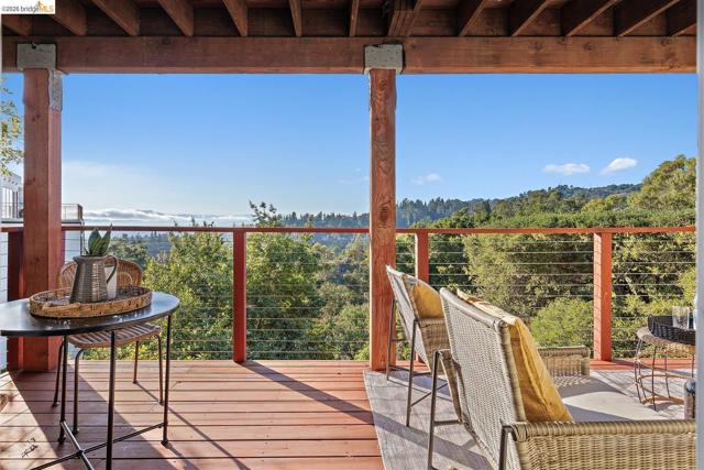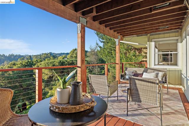 Wake up to breathtaking SF Bay, Mt Tam, Angel Island and Marin views from this one-of-a-kind Oakland hills retreat located just minutes from Oakland's Montclair Village. This charming, 2-story home blends warmth and character with indoor/outdoor living, and has 2 bedrooms, 1 bathroom and an open living room/dining room/kitchen on the main level, plus a lower level with a 3rd bedroom, full bathroom, large family room and two bonus rooms. Details include granite kitchen counters with a mosaic tile backsplash, hardwood floors and abundant natural light, all framed by beautiful beamed, pine plank ceilings that add rustic charm as well as architectural interest. The main floor primary bedroom and lower level family rooms both offer direct access to spacious decks that take full advantage of Oakland's near-perfect weather and the beautiful water, city and wooded hillside views. The expansive, lushly landscaped backyard feels like a private escape with a small vineyard with mature grape vines, perfect for anyone who appreciates a touch of country living. Whether you're hosting guests, enjoying a serene sunset, or gathering grapes from your own backyard, this home offers a rare combination of natural beauty, comfort and exceptional views. Experience East Bay living at its very best!