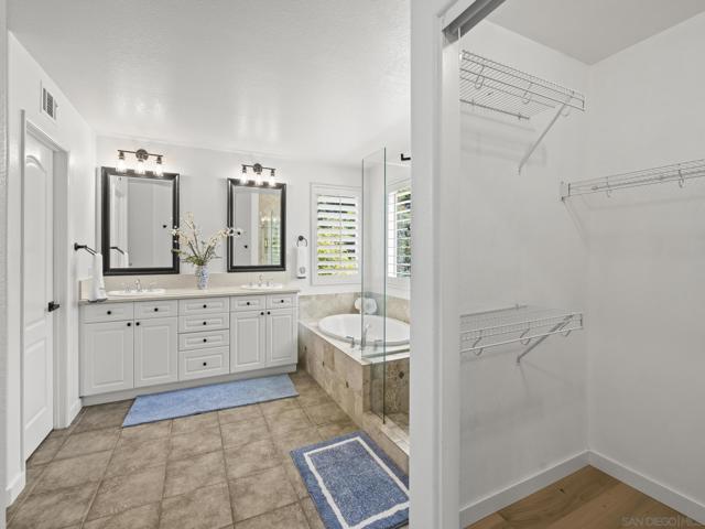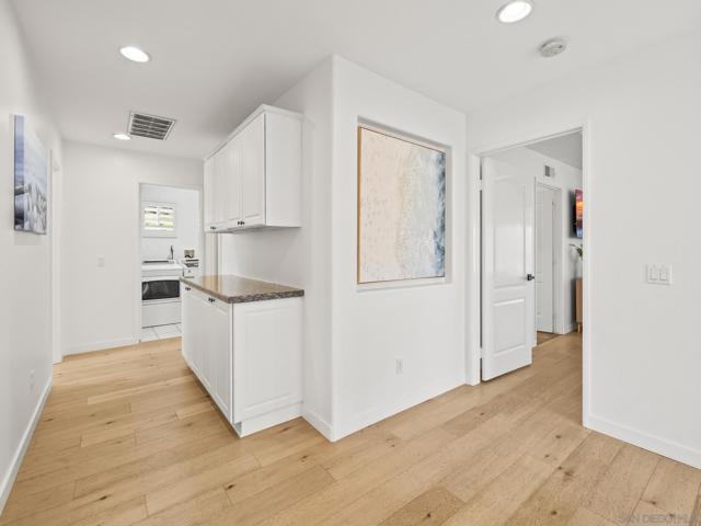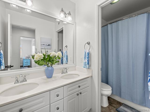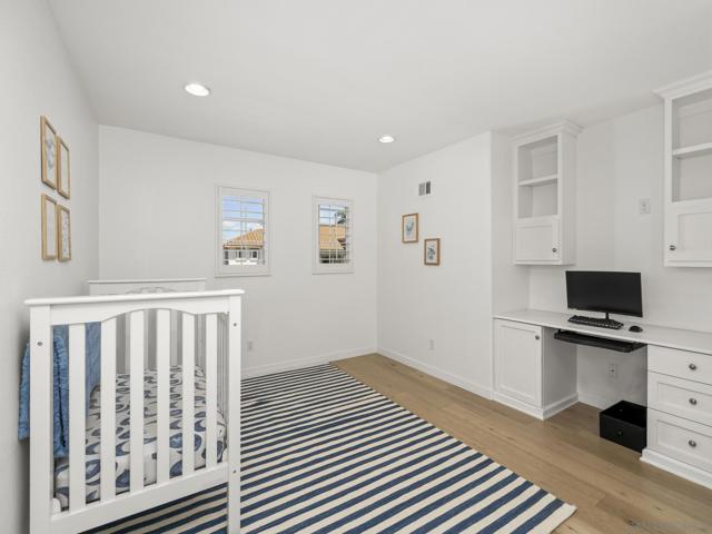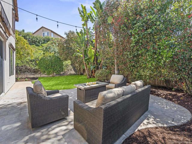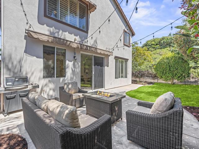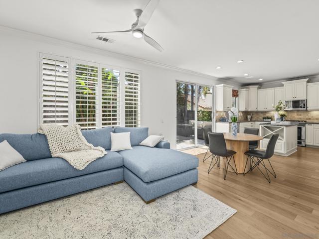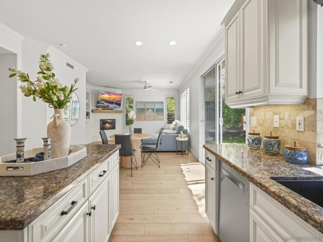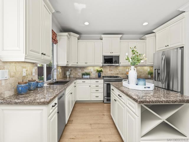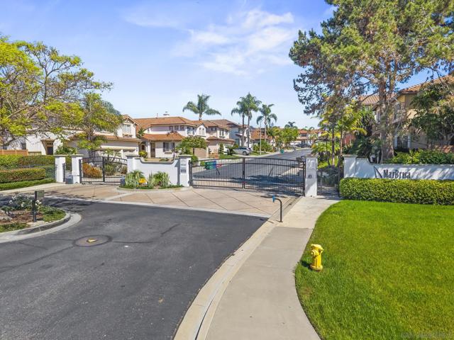 Set within the gated hilltop community of Mar Brisa, this thoughtfully upgraded home is ideally positioned with no home directly behind and no neighbor to the south. The result is a rare sense of openness and privacy, complemented by a southwest-facing backyard that enjoys great natural light throughout the day and well-maintained landscaping. Inside, the home has been tastefully improved with hardwood flooring throughout and a remodeled kitchen featuring quartz counters, white cabinetry, stainless steel appliances, a walk-in pantry, under-cabinet lighting, and a center island with wine storage—all opening to the main living areas for an open, connected feel. Since purchasing, the current owners have continued to elevate the home with custom built-ins in the living room, an updated fireplace mantel, and fresh interior and exterior paint. White plantation shutters add a clean, cohesive finish throughout. Additional highlights include 20 owned solar panels paired with a Tesla Powerwall, newer central HVAC, an upstairs laundry room, and a well-balanced floor plan with four bedrooms upstairs, including a spacious primary suite with dual walk-in closets. The garage is finished with epoxy flooring and built-in cabinetry for added functionality and storage. Located just steps from the community pool, less than a 10-minute drive to the beach, and within the highly regarded Carlsbad school district, this home offers a compelling blend of privacy, convenience, and coastal lifestyle.
