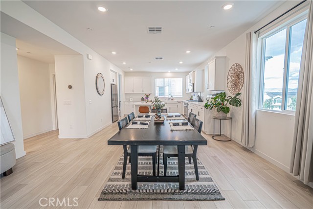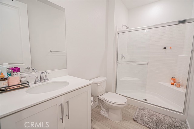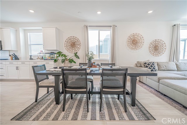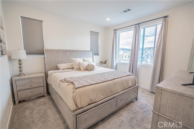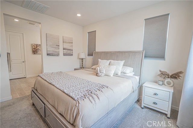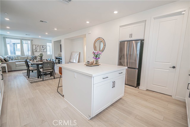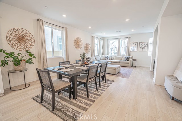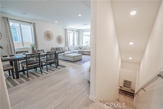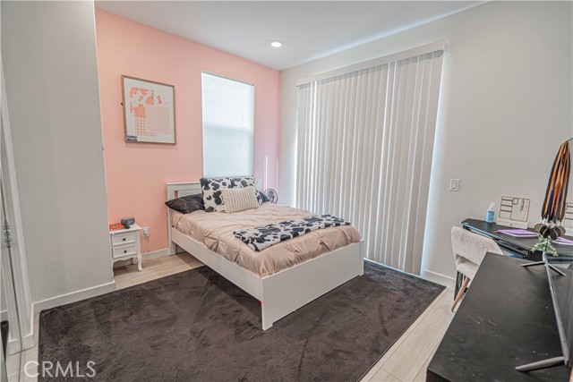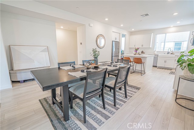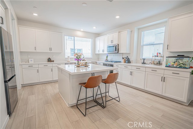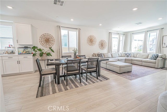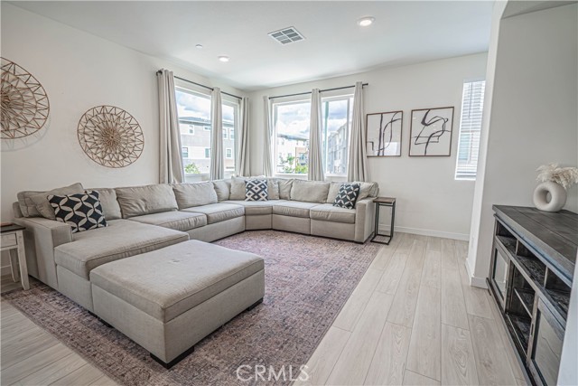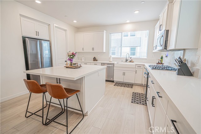 Welcome to this beautifully upgraded 4-bedroom, 3-bath home that perfectly blends comfort, style, and convenience. Featuring a highly desirable layout with a full bedroom and bathroom on the main level, this home is ideal for guests, multi-generational living, or a private home office. Step inside to find an abundance of natural light flowing throughout the home, highlighting the laminate flooring and modern finishes. The updated kitchen is the true centerpiece, boasting quartz countertops, upgraded cabinetry and hardware, a large center island, and a charming farmhouse sink—perfect for both everyday living and entertaining. Additional features include recessed lighting throughout and a convenient indoor laundry area. Step outside to enjoy your own private front patio—an inviting space to relax or host guests. Located in a sought-after community offering multiple pools, parks, and a clubhouse, this home also provides easy access to the 5 freeway, making commuting a breeze. This is the perfect combination of upgraded living and prime location—don’t miss the opportunity to make it yours!
