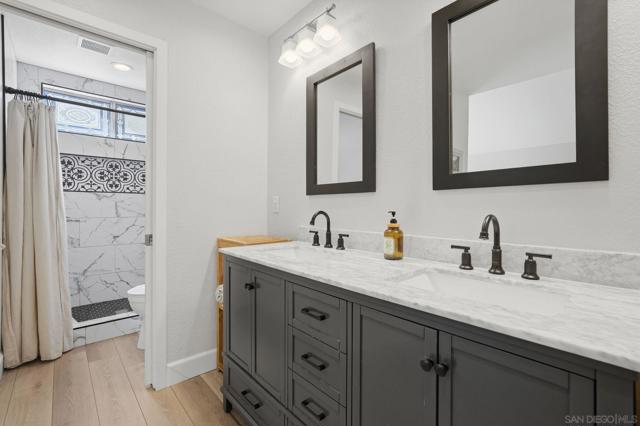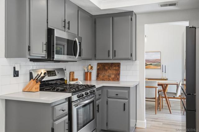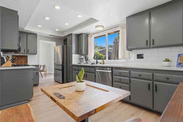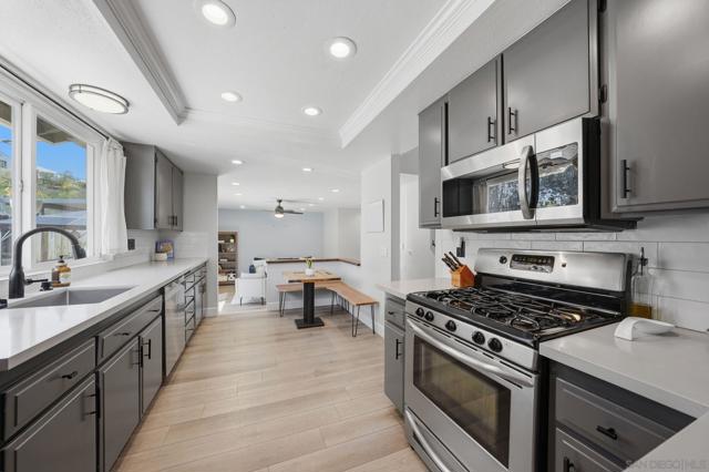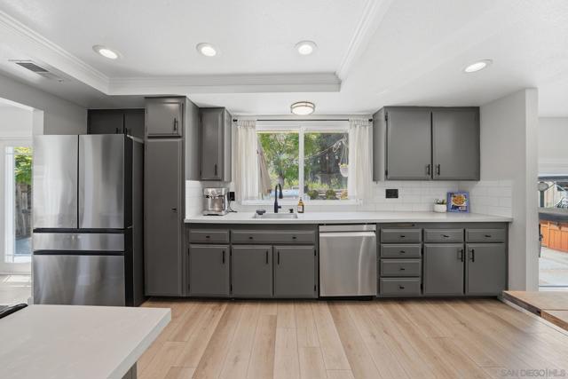 Completely renovated and thoughtfully reimagined, this bright and airy 4-bedroom residence offers the ultimate blend of style and functionality. Situated in the Santee Lakes neighborhood, the home makes a stunning first impression with soaring vaulted ceilings and an abundance of natural light that flows throughout the open-concept floor plan. The interior features multiple versatile living areas, a renovated kitchen, and beautifully updated bathrooms. Every detail has been addressed, including updated premium flooring, dual-pane windows, and contemporary fixtures. Energy efficiency is built-in with fully paid-off SOLAR panels, ensuring low utility costs year-round. The transition to outdoor living is seamless, leading to a private entertainer’s backyard complete with an outdoor kitchen, lush landscaping, and ample space for hosting. The property even boasts RV/boat parking. Located just minutes from trails, parks, coffee shops, restaurants, and all that Santee has to offer, this turnkey home offers modern luxury in a prime location.