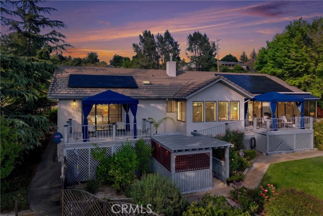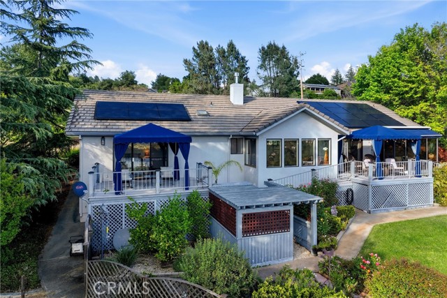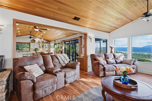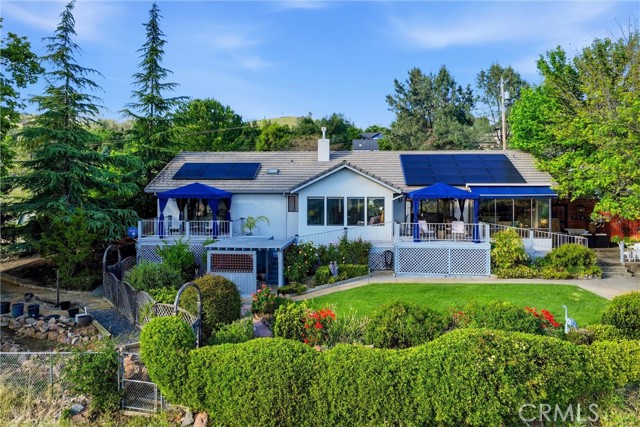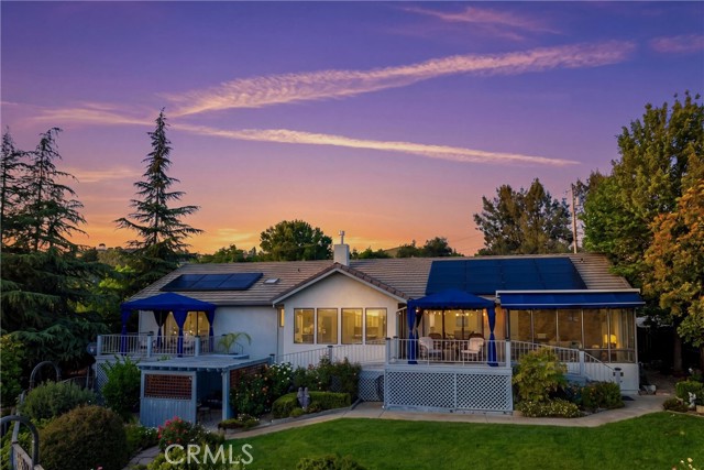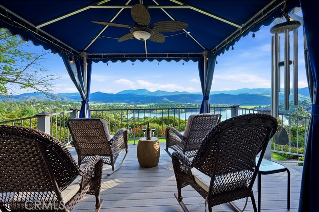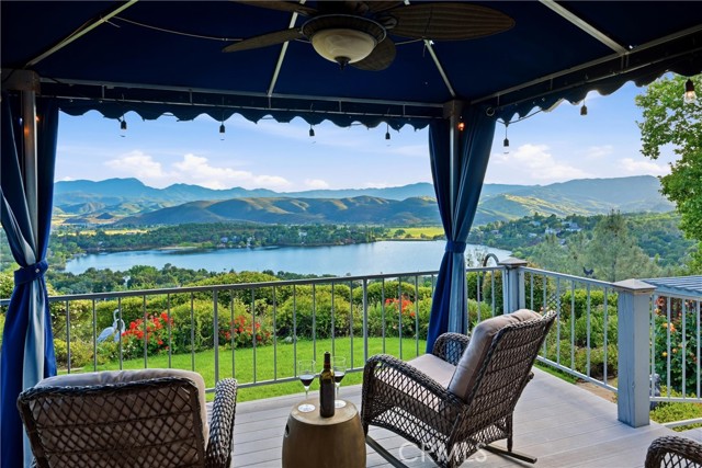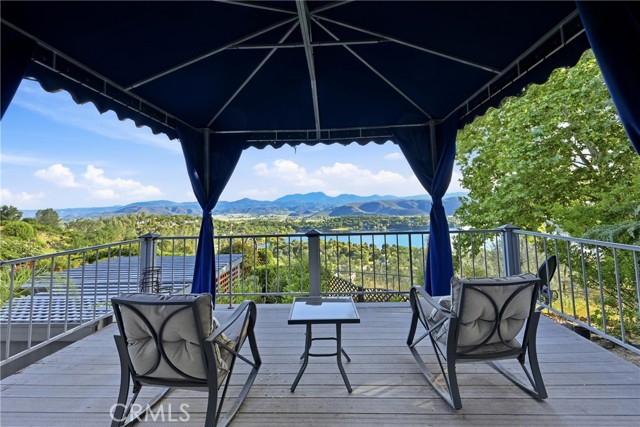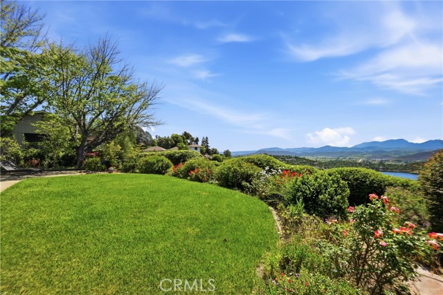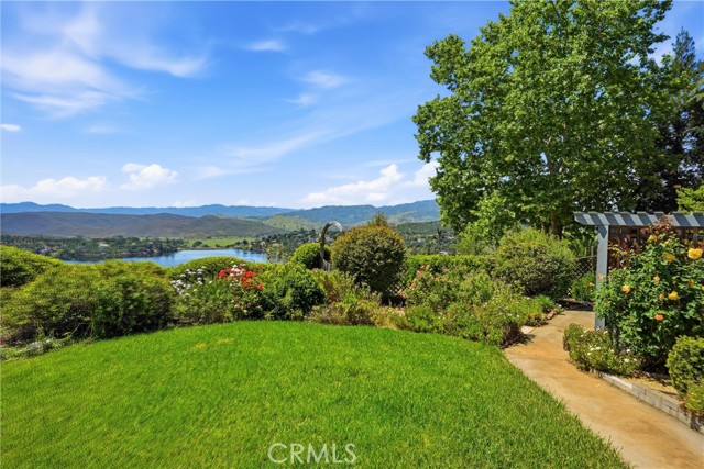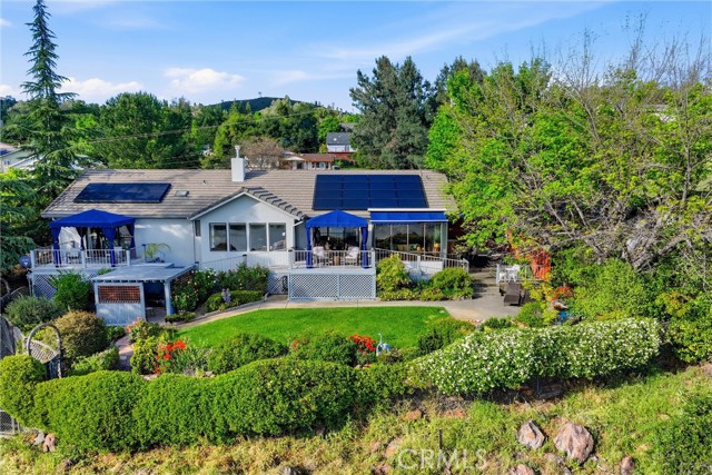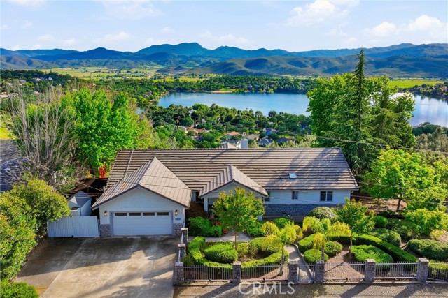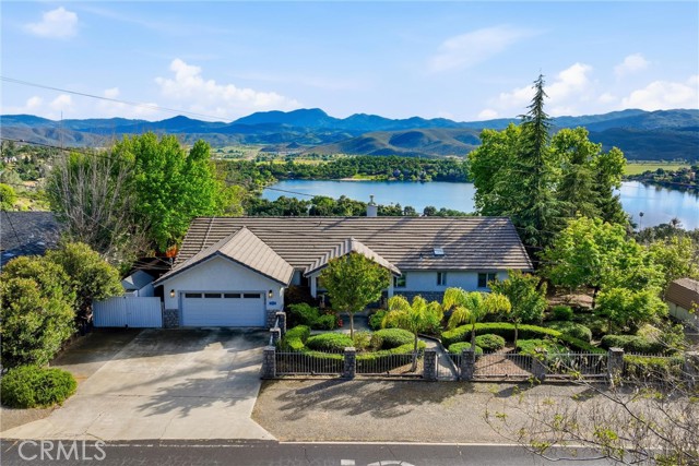 Experience quintessential California living with sweeping, million-dollar views. Set on over 1.2 acres, this beautifully remodeled residence offers a rare blend of privacy, comfort, and understated luxury. Step through the gated entry into a serene front courtyard, where mature landscaping and meandering pathways create a warm and inviting arrival. Inside, a sense of understated luxury meets comfortable, livable design. Expansive picture windows stretch along the rear of the home, framing breathtaking views of the lake, valley, and surrounding mountains—an ever-changing backdrop that defines daily living here. Vaulted ceilings with inlaid clear, hard redwood tongue-and-groove detailing add warmth and architectural character, while a stacked stone gas fireplace anchors the living space. The dream kitchen pairs function with craftsmanship, featuring custom tile work that echoes the rich wood tones above, luxurious, upgraded cabinetry with abundant storage, and premium stainless steel appliances including a double oven, 5-burner cooktop with hood, and reverse osmosis drinking water at the sink. Just beyond, a light-filled sunroom invites year-round enjoyment—an ideal place for morning coffee or quiet evenings, all while taking in the view. The home offers comfortable living spaces with three ample-sized bedrooms, including a well-appointed primary suite designed as a private retreat. Vaulted ceilings, a large triple-wide slider to capture the views, and direct access to a private deck create a seamless indoor-outdoor connection. The remodeled primary bath features large-format tile, dual sinks, upgraded fixtures, a private water closet, and a walk-in closet. Outdoors, the grounds unfold like a private garden retreat. Winding paths lead to multiple seating and patio areas, a covered BBQ space, lush lawn area, and thoughtfully curated plantings including rose and herb gardens, fruit trees, and raised beds. A tranquil redwood grove adds a sense of place and permanence, offering both shade and natural beauty. Plenty of level parking spaces including parking for a boat or RV. Extensive upgrades enhance both efficiency and ease of living, including owned solar, a lifetime tile roof, newer HVAC system, whole house fan, motorized retractable awnings, deer-proof fencing and composite decking. This is more than a home—it’s an invitation to slow down, take in the views, and enjoy a lifestyle defined by beauty, comfort, and connection to the land.