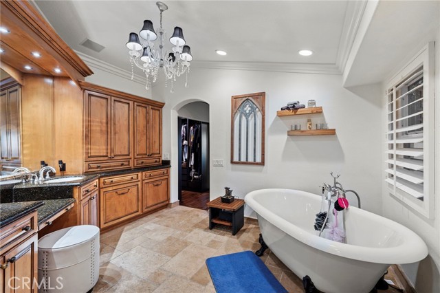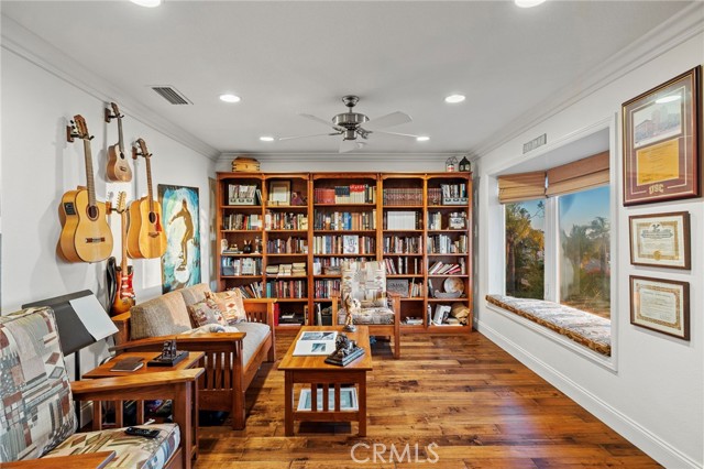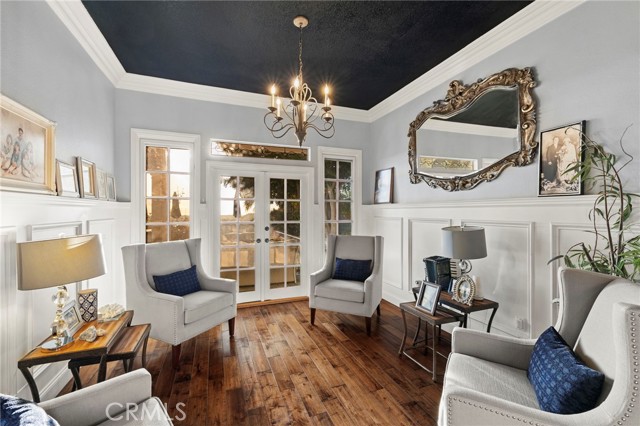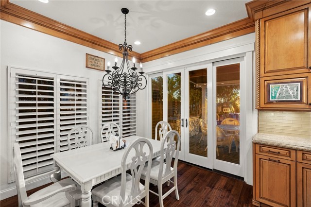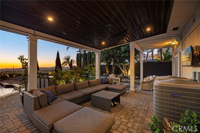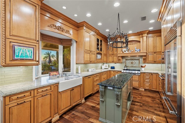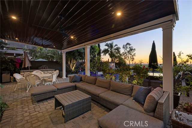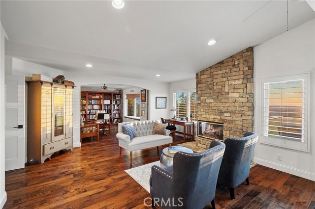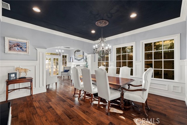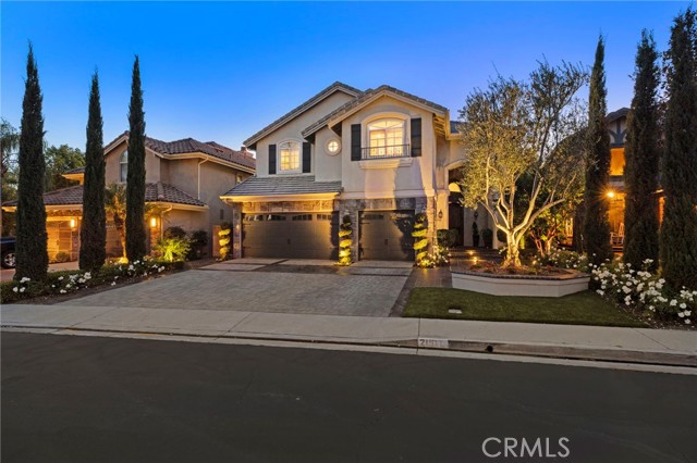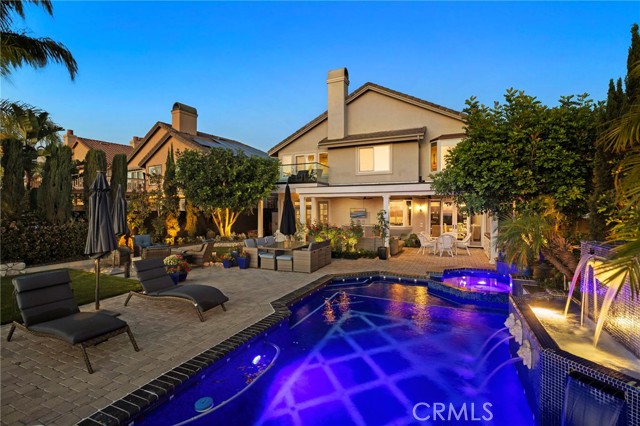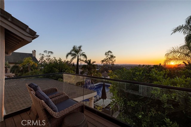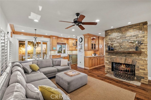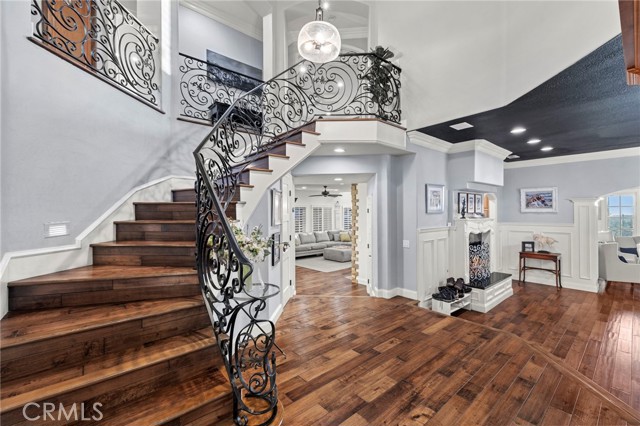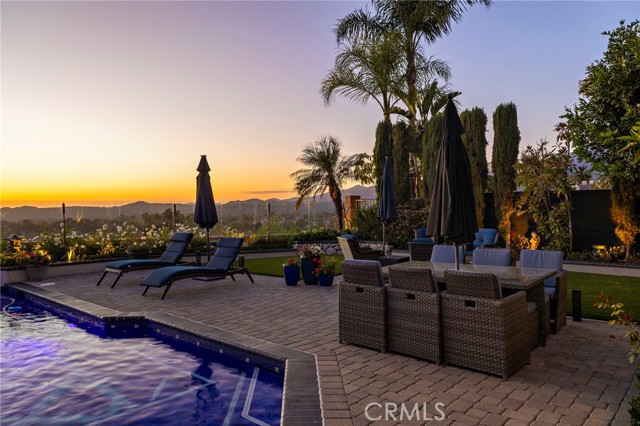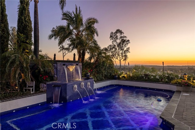 Completely reimagined and meticulously remodeled, this exceptional residence in the highly sought-after Rancho Cielo community of Trabuco Canyon blends luxury, comfort, and modern efficiency. Featuring 5 bedrooms, 3.5 bathrooms, approximately 3,728 square feet, plus a large bonus room and a private library/retreat off the primary suite, this home is designed for both everyday living and entertaining. A custom solid wood front door welcomes you into a beautifully upgraded interior with hardwood flooring, wainscoting, crown molding, plantation shutters, and a striking wrought iron staircase. The chef’s kitchen showcases custom double-stacked alder cabinetry, granite countertops, a large center island, Sub-Zero refrigerator/freezer, Bosch dishwasher, six-burner gas cooktop, double ovens with warming drawer, Shaw’s fireclay farmhouse sink, under-cabinet lighting, and a butler’s pantry. An extended slider creates seamless indoor-outdoor flow. Modern upgrades include solar, new HVAC and ducting, dual-pane windows, NEST climate control, Simply Safe security, built-in speakers, recessed lighting, and ceiling fans throughout. The primary suite offers a fireplace, spa-inspired bath with dual-head shower, and a private balcony with glass panels to capture sweeping views. Additional fireplaces in the dining and family rooms add warmth and charm. The backyard is a true retreat with a custom-tiled pool, paver decking, built-in BBQ island, and covered patio with shiplap ceiling, lighting, fans, outdoor TV, and drop-down shades. Professionally landscaped with synthetic turf, olive tree, lighting, glass fencing, and smart irrigation. Ideally located near Santa Margarita Lake, top-rated schools, scenic trails, and golf, this home offers incredible sunset views with ocean glimpses on clear days and views toward the Palos Verdes hills.