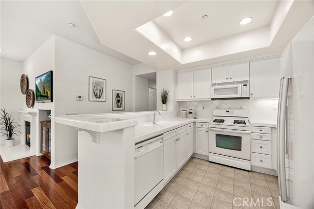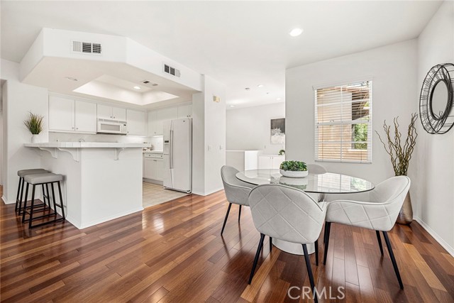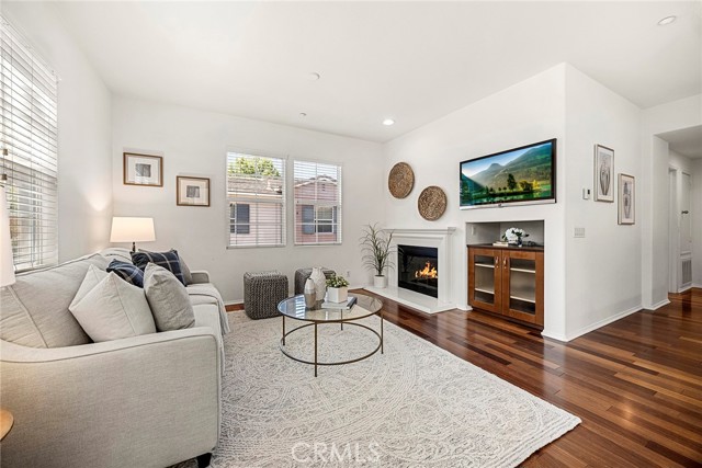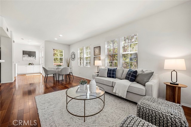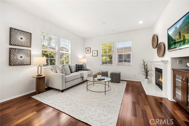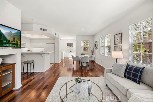 Tucked into the highly sought-after community of Quail Hill, this end unit carriage style condo offers an abundance of natural light, great room concept living and desirable location. This thoughtfully designed layout allows for single level living with no one above and direct entry and access to the two-car garage below. Accented throughout with warm wood flooring, new carpet and neutral wall colors this home exudes warmth. The large living room offers multiple walls of windows, custom built in, fireplace and effortlessly opens to the adjacent kitchen with casual dining counter, separate dining area and access to the private balcony. The generously sized primary suite boasts a dual vanity counter, soaking tub/shower combination and oversized walk in closet. The secondary bedroom also sizeable in nature has access to a full hall bathroom. Enjoy close proximity to the numerous HOA amenities inclusive of multiple pools, spas, tennis courts, playgrounds, parks and more. Easy access to numerous hiking trails, freeways, shopping, dining and highly acclaimed schools. This home offers a rare combination of location, floor plan and serenity to call home.