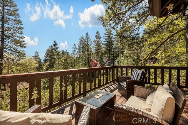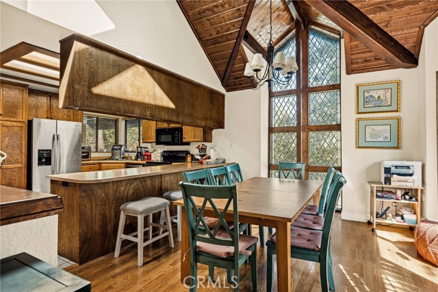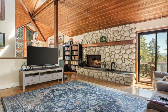 Charming mountain retreat located in the desirable Lake Arrowhead community with lake rights!. This 3-bedroom, 2-bath home offers 1,497 sq ft of living space on a 10,475 sq ft lot, surrounded by trees for a peaceful, private setting. Built in 1984, the home features classic alpine details including vaulted beamed ceilings and tongue-and-groove wood finishes throughout. Newer roof and exterior paint. Main level includes a bedroom and full bath, along with an open-concept living area. Living room is highlighted by a floor-to-ceiling river rock fireplace, creating a warm and inviting focal point. Kitchen offers a breakfast bar and flows into the dining area, ideal for everyday living and entertaining. Property includes an attached 2-car garage with level entry and an extended driveway providing ample additional parking. Enjoy tranquil forested surroundings while being conveniently located near local amenities, recreation, and all that Lake Arrowhead has to offer. Ideal for full-time living, second home, or investment opportunity.