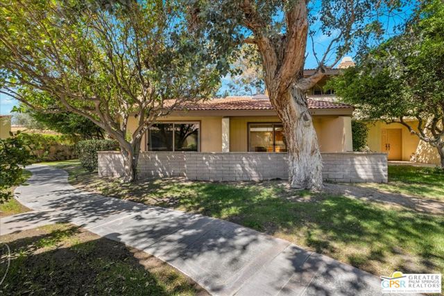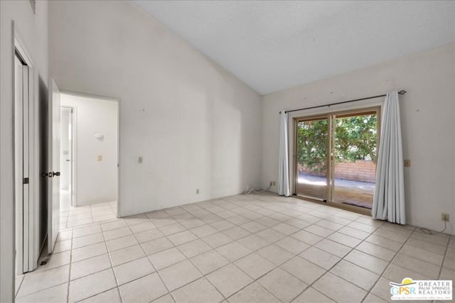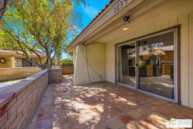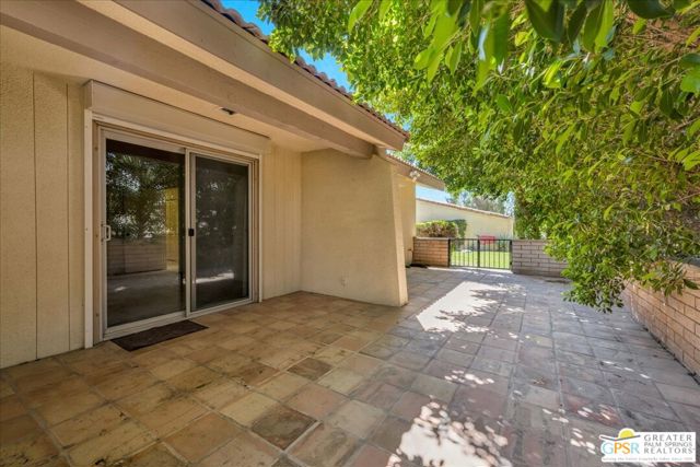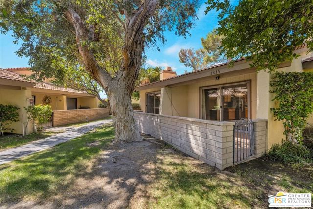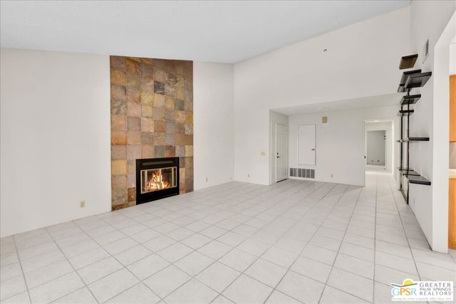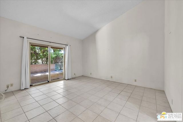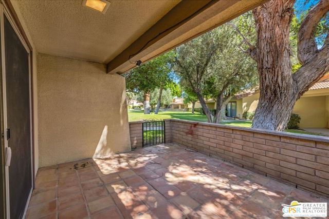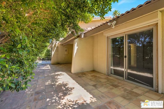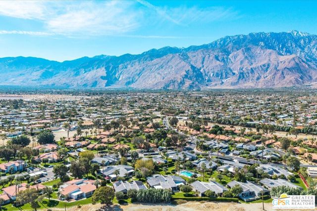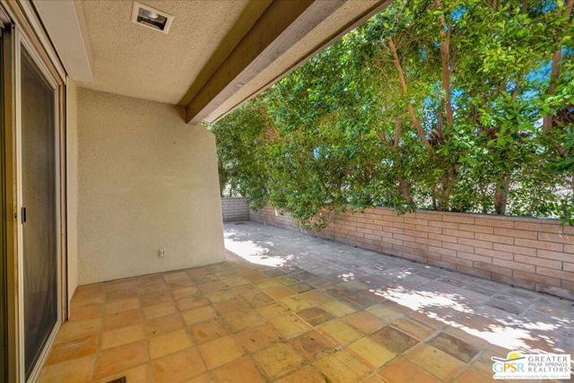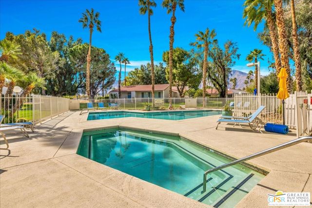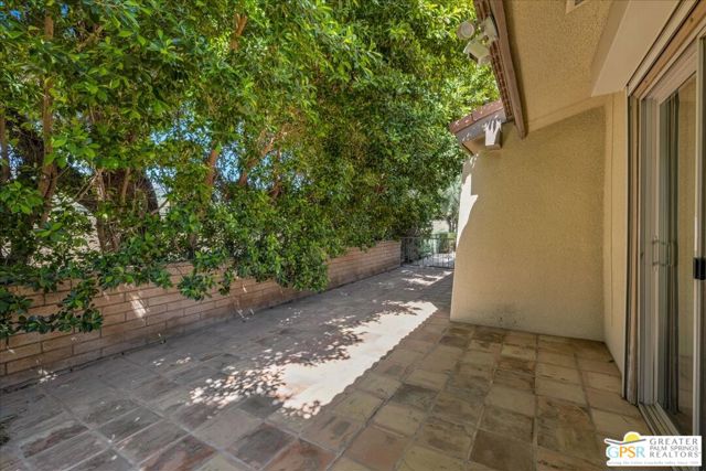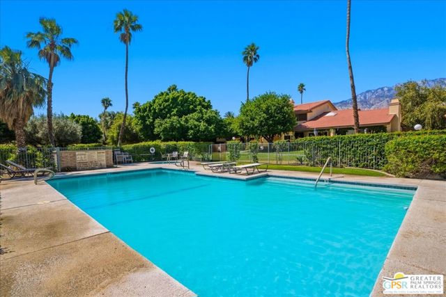 Welcome to Palm Springs Country Cluban iconic gated community designed by renowned mid-century architect William F. Cody where timeless design meets resort-style living. This 2-bedroom, 2-bath end-unit condo offers approximately 1,538 sq ft of interior space and is ideally located in Phase 5, one of the most desirable sections of the community. Being an end unit, it provides added privacy, abundant natural light, and convenient proximity to parking. The home features two spacious private patios, a rare and highly desirable setup. Enjoy stunning San Jacinto Mountain views from the west-facing patio, while the second patio opens to lush garden surroundings creating the perfect indoor-outdoor desert lifestyle. Inside, you will find soaring vaulted ceilings, a gas fireplace with tile surround, and an open-concept living space filled with natural light. The kitchen offers mid-century inspired design elements, including an island, wood cabinetry, stainless steel appliances, and a skylight that brightens the space throughout the day. Large sliding doors from both the living room and kitchen create seamless access to the patios. The primary suite is generously sized with direct patio access, mountain views, dual vanities, and a walk-in closet. A spacious guest bedroom also features patio access, complemented by a well-sized guest bath. Additional features include an in-unit washer and dryer with newer appliances. Palm Springs Country Club offers resort-style amenities, including beautifully landscaped grounds, a sparkling pool, spa, and included services such as water, and trash, all within a peaceful, well-maintained gated setting. This is a successor trust sale and presents a fantastic fixer opportunity to customize and add value within a historically significant mid-century community. With solid bones, a desirable layout, and an unbeatable setting, this unit is ready for your vision. Bring your ideas and make it your own, opportunities like this are rare, and the property is being sold as-is, where-is.