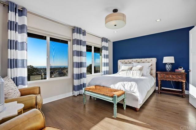 Recently Renovated Coastal Townhome with Panoramic Ocean Views Beautifully renovated townhome in the heart of Carlsbad offering sweeping 180-degree ocean views and abundant natural light throughout. The open-concept living and dining areas feature wide-plank wood flooring, plantation shutters, and a striking tiled fireplace wall that anchors the main living space. The updated kitchen includes a large center island with contrasting cabinetry, farmhouse sink, stainless steel appliances, glass vent hood, breakfast bar seating, and a built-in wine bar area. Sliding doors open to a private patio, ideal for outdoor dining and enjoying coastal breezes. Upstairs, the primary suite offers expansive ocean views and a spacious walk-in closet. A secondary bedroom features its own fireplace, creating a cozy retreat for guests or a flexible bonus space. Bathrooms have been remodeled with modern vanities, updated fixtures, sleek tilework, and a frameless glass shower. Additional features include in-unit laundry, an attached garage, and extra storage. Located in a quiet, well-maintained community just minutes to beaches, shopping, dining, parks, coastal trails, top-rated Carlsbad schools, and easy access to I-5. Move-in ready with panoramic views and thoughtful upgrades throughout.