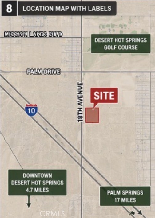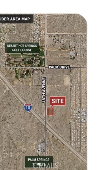 Prime 10-acre vacant land opportunity located at the corner of Palm Dr & 18th Ave in Desert Hot Springs. Zoned Mixed-Use Corridor, this property offers excellent development potential for a variety of uses including residential, commercial, or mixed-use projects (buyer to verify). Positioned along Palm Dr, a major roadway, the property benefits from strong visibility and accessibility. The corner location further enhances flexibility for future development. Located across from a golf course, offering added appeal and future development potential. The property is located within a designated development area and offers strong long-term investment potential. Buyer to verify buildability and all development requirements with the City of Desert Hot Springs. No assigned street address. Property is identified by APN 657-280-015. Buyer to verify all information including zoning, utilities, boundaries, and development potential with the City of Desert Hot Springs and appropriate agencies. Excellent opportunity for investors, builders, and developers seeking land in a growing area.