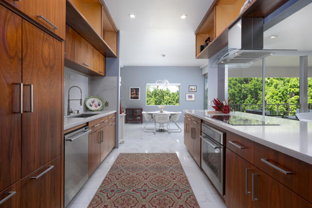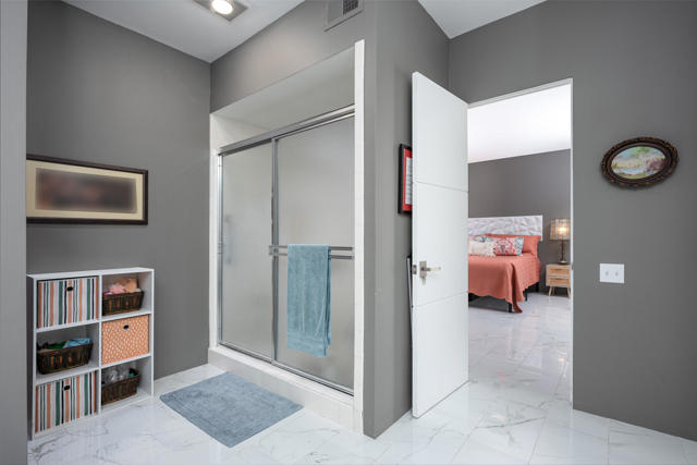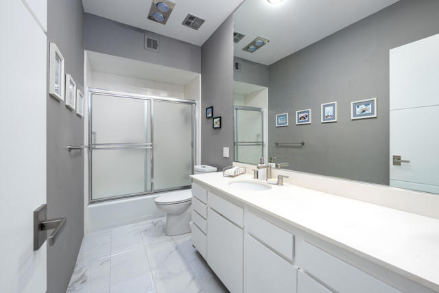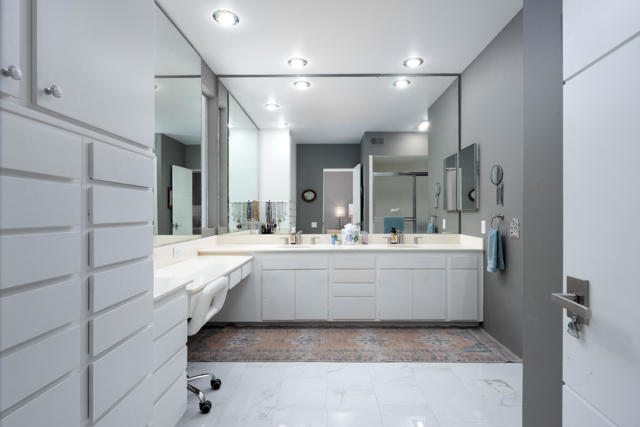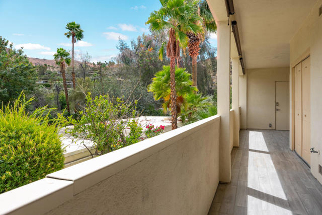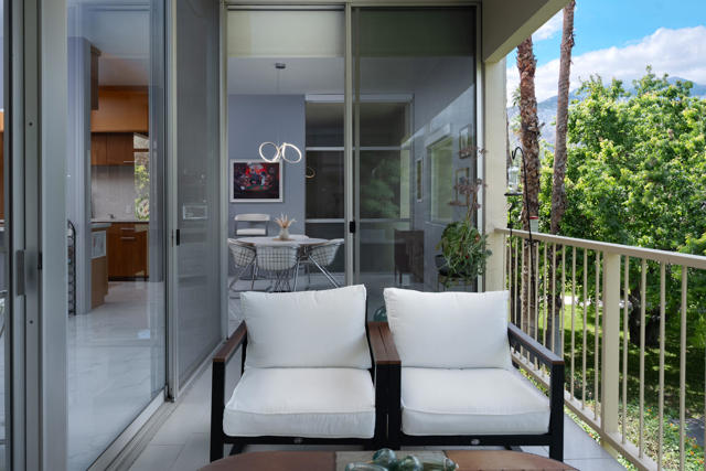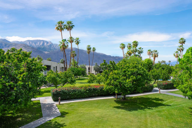 Set within the iconic Seven Lakes Golf and Country Club, this upper-level residence captures sweeping, park-like, greenbelt views and an effortless sense of openness.The two-bedroom, two-bath layout is thoughtfully designed, with an airy open plan finished in porcelain tile flooring that extends throughout the living spaces.The reimagined kitchen is finished with warm walnut cabinetry including a paneled refrigerator, stainless appliances and a generous breakfast bar. It flows seamlessly into an expansive dining area and living room, where a striking textured accent wall creates a sophisticated focal point. Floor-to-ceiling glass and sliding doors invite natural light while opening to a large covered patio and its magical San Jacinto mountain views, reinforcing the home's indoor-outdoor connection.Both bedrooms offer direct access to a private rear patio, facing the iconic Southridge estates There you'll find the convenient full size laundry area. The primary suite features dual closets--including a walk-in--and an en-suite bath with double vanities, a spacious shower, and abundant built-in storage. The guest bedroom, also with a walk-in closet, is positioned near a well-appointed bath.A private two-car garage adds convenience, while the home's location places you moments from the community's largest pool and the renowned William Cody Clubhouse, offering dining, lively social spaces, and views across the Ted Robinson-designed golf course. Within this 24-hour guard-gated enclave, residents enjoy a secure, amenity-rich environment--ideal as a full-time residence or a tranquil desert retreat.