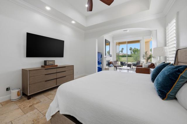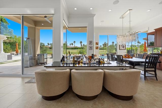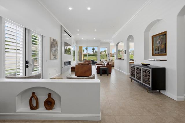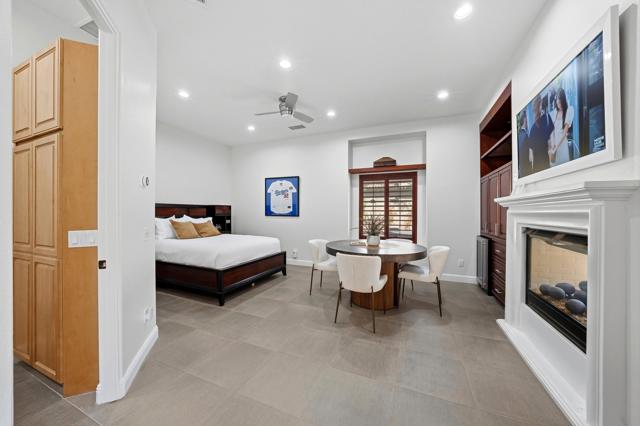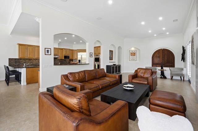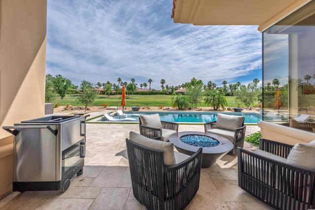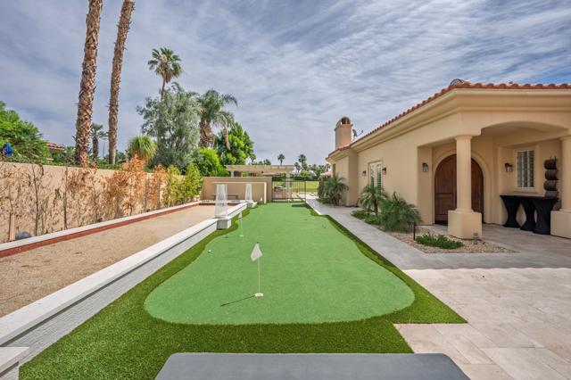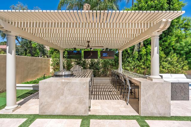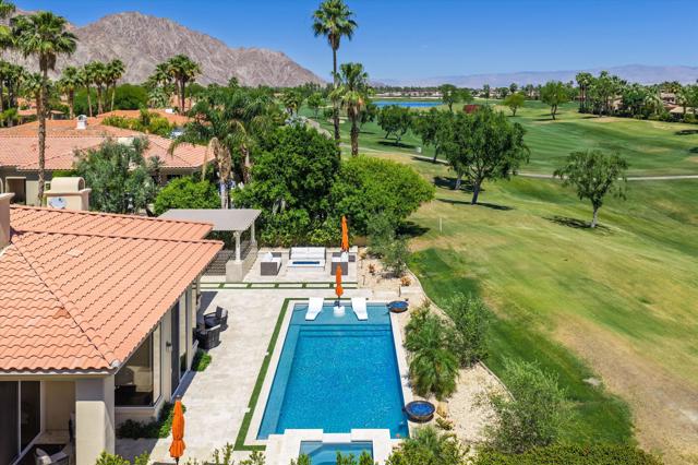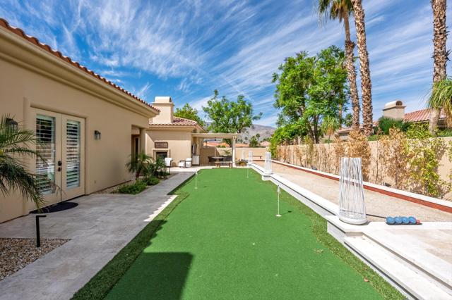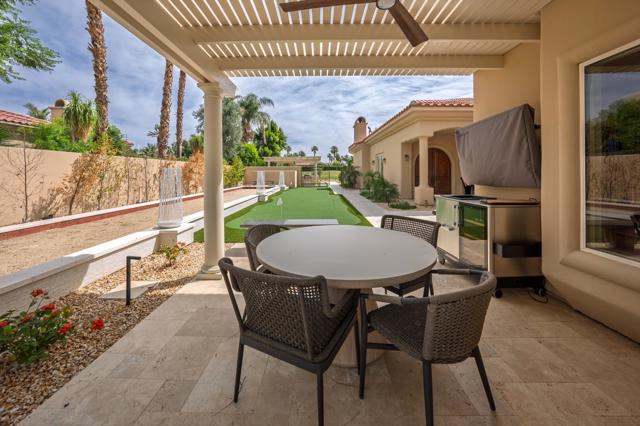 Spectacular Santa Barbara-style entertainer's estate on an oversized, private lot overlooking Hole 16 of PGA WEST Weiskopf private course. This 3,465 square feet home features four en-suite bedrooms plus a detached casita, a massive walled courtyard entry and a chef's kitchen with new Wolf appliances. Newly painted interiors, gas fireplace with slab surround and designer lighting complete the elegant living spaces -- but the showstopper is the backyard, built for unforgettable gatherings.An entertainer's paradise, the outdoor compound is fully outfitted for seamless indoor/outdoor living and large-scale events. The newly resurfaced PebbleTec pool features a swim step, integrated lights and drains, and automated fire & water bowls for dramatic nighttime ambiance. Two gas fire pits and multiple lounge zones create conversation areas for intimate evenings or large parties, while a dedicated bocce court and a putting green provide recreational options that appeal to all ages. Pergola and gazebo covers define outdoor dining and lounge spaces, and extensive high-end outdoor furniture with portable beverage units keeps guests comfortable and refreshed.The outdoor kitchen and bar are stadium-grade: Taj Mahal slab counters, multiple refrigerated drawers, a Perlick ice maker plus two Perlick beverage coolers, an EVO grill and Twin Peaks grill combine for full-service catering capability. Five high-end full-sun outdoor TVs, a full indoor/outdoor Sonos audio system with new speakers and strategically placed lighting and landscape hardscaping transform the yard into a private resort. Air-conditioned garages with epoxy floors, makes this property a turn-key entertainer's dream. Perfect for golf course lifestyle living and grand-scale entertaining, this home delivers resort-caliber amenities and meticulous outdoor design for year-round enjoyment.