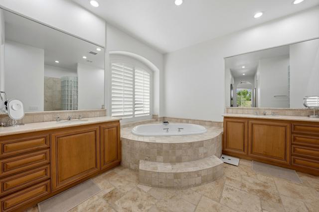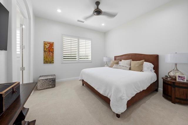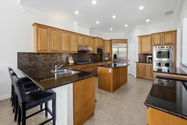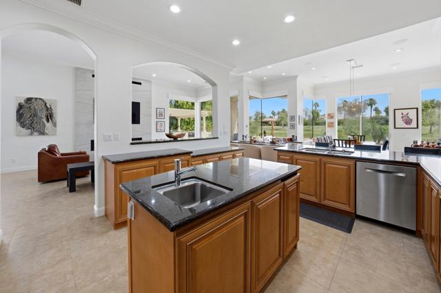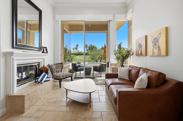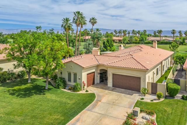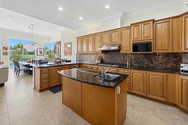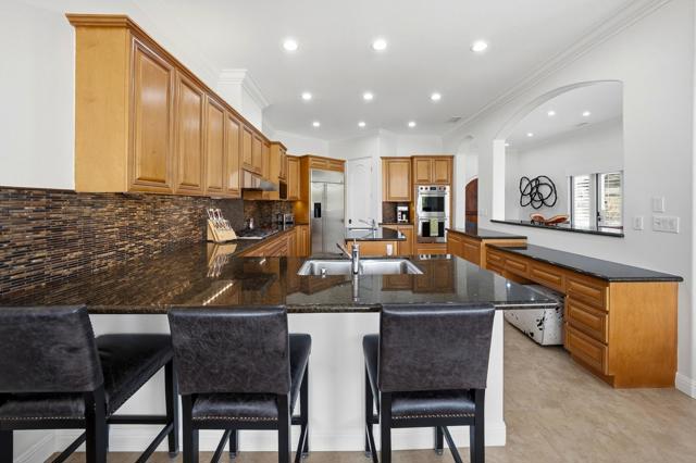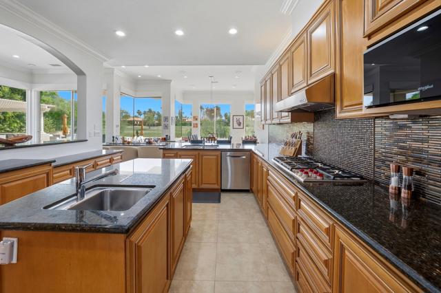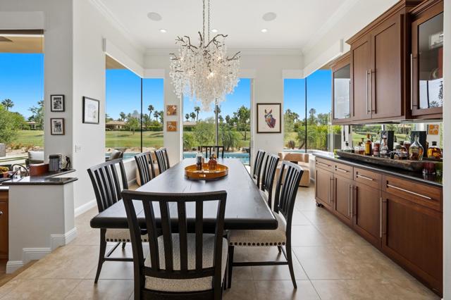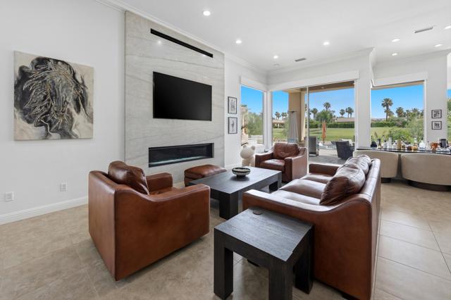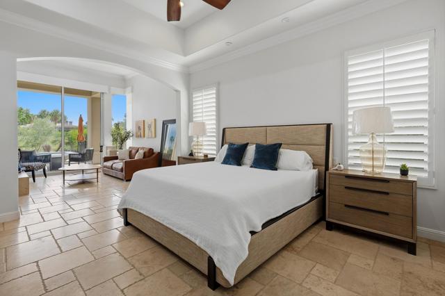 Spectacular Santa Barbara-style entertainer's estate on an oversized, private lot overlooking Hole 16 of PGA WEST Weiskopf private course. This 3,465 square feet home features four en-suite bedrooms plus a detached casita, a massive walled courtyard entry and a chef's kitchen with new Wolf appliances. Newly painted interiors, gas fireplace with slab surround and designer lighting complete the elegant living spaces -- but the showstopper is the backyard, built for unforgettable gatherings.An entertainer's paradise, the outdoor compound is fully outfitted for seamless indoor/outdoor living and large-scale events. The newly resurfaced PebbleTec pool features a swim step, integrated lights and drains, and automated fire & water bowls for dramatic nighttime ambiance. Two gas fire pits and multiple lounge zones create conversation areas for intimate evenings or large parties, while a dedicated bocce court and a putting green provide recreational options that appeal to all ages. Pergola and gazebo covers define outdoor dining and lounge spaces, and extensive high-end outdoor furniture with portable beverage units keeps guests comfortable and refreshed.The outdoor kitchen and bar are stadium-grade: Taj Mahal slab counters, multiple refrigerated drawers, a Perlick ice maker plus two Perlick beverage coolers, an EVO grill and Twin Peaks grill combine for full-service catering capability. Five high-end full-sun outdoor TVs, a full indoor/outdoor Sonos audio system with new speakers and strategically placed lighting and landscape hardscaping transform the yard into a private resort. Air-conditioned garages with epoxy floors, makes this property a turn-key entertainer's dream. Perfect for golf course lifestyle living and grand-scale entertaining, this home delivers resort-caliber amenities and meticulous outdoor design for year-round enjoyment.