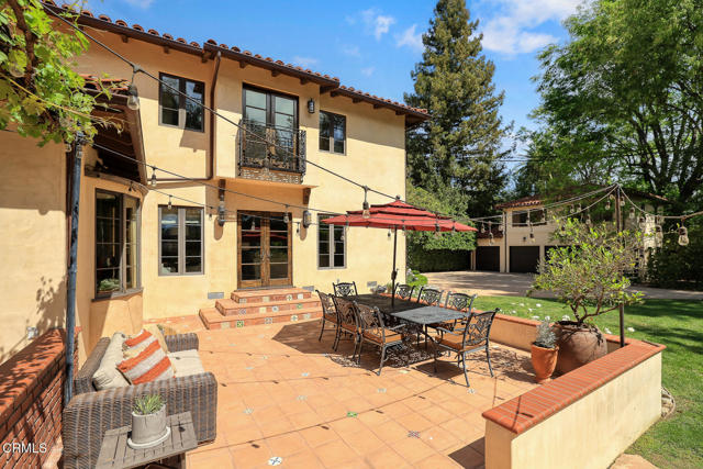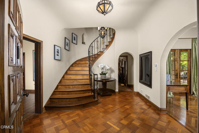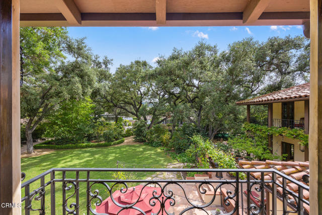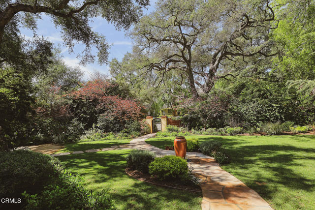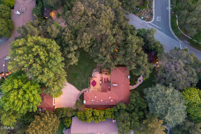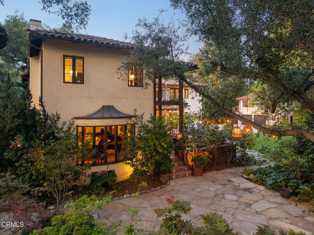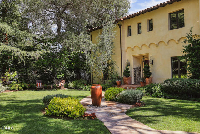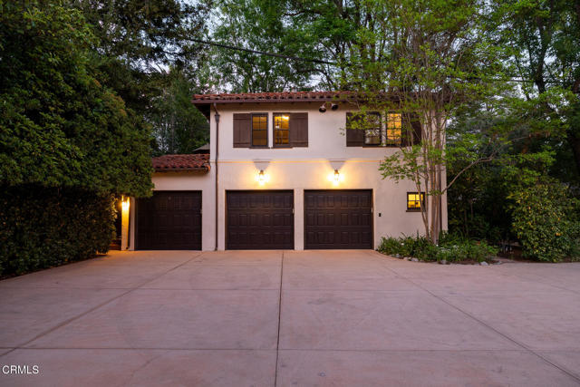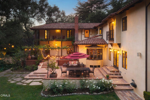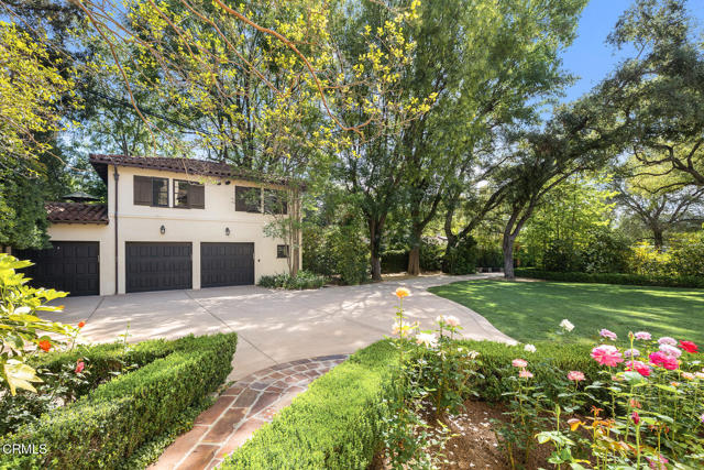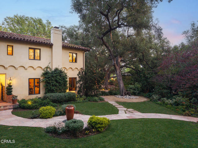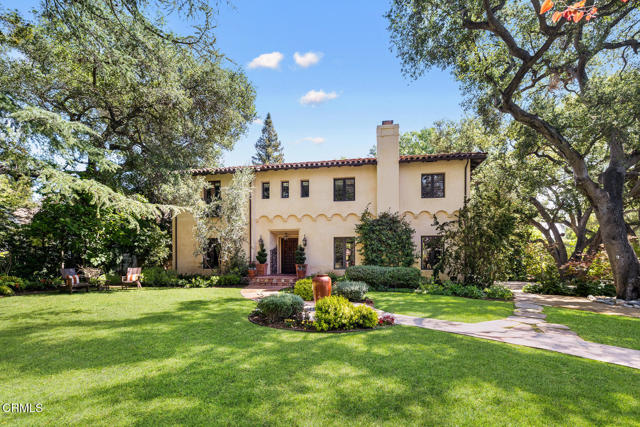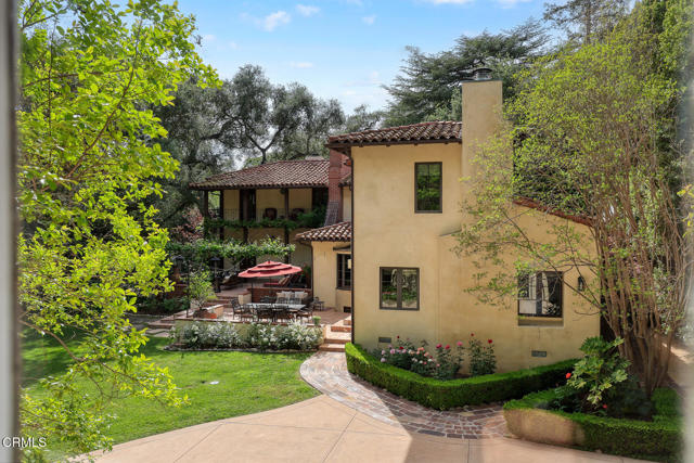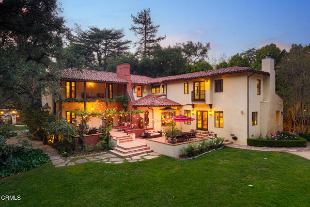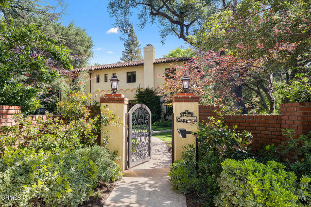 Welcome to 'Casa de Encinas', a masterfully reimagined estate that epitomizes timeless elegance and modern luxury in the coveted La Canada Flintridge. Nestled on over 3/4 of an acre of flat, gated land, this 5,515 sq. ft. home (including guest house), Italian Period Revival masterpiece--originally crafted in 1941 by renowned AIA architect Horatio W. Bishop-offers an unparalleled blend of architectural heritage, contemporary sophistication, and serene privacy. Enveloped by a canopy of oak trees, the estate welcomes you with manicured gardens, a pillared iron gate, and a flagstone path that winds past a tranquil fountain to the grand covered entry. The home's striking facade and commanding presence set the tone for the exquisite details within. A seamless marriage of original craftsmanship and modern updates. Hardwood floors lead from the vaulted foyer, where a spiral staircase with oak treads ascends gracefully beneath an original stained-glass window and chandelier. The formal living room with a stately fireplace, soaring ceilings, and French doors framing enchanting garden views. The formal dining room flows effortlessly into the chef's kitchen-A dream space featuring custom cabinetry, grand center island, stone countertops, top-tier appliances, and large pantry. A breakfast bar connects to the cozy yet spacious family room, with a second fireplace, dining nook, and seamless access to the outdoor patio. For work or leisure, the main level offers a light-filled office/library or bedroom, with built-ins and guest bath access, as well as a state-of-the-art private theater, equipped with surround sound and projection. The second-floor hosts three guest bedrooms in addition to a stunning primary suite. The spa-like primary bath boasts a double vanity, soaking tub, oversized shower, and private water closet. Two sets of French doors open to a covered, large balcony overlooking the lush grounds. Two guest rooms share a bath between, the third serviced by a guest bathroom in the hall. Meticulously landscaped grounds evoke the serenity of nearby Descanso Gardens, including multiple sitting patios and a 165-square-foot floral studio with temperature control. Tiled patios invite al fresco dining, and expansive lawn offers endless possibilities. Detached three-car garage, a workshop and a storage room. Above it, a private 624-square-foot guesthouse with a kitchenette, living area, bedroom, and 3/4 bath. A Rare opportunity for a discerning buyer.