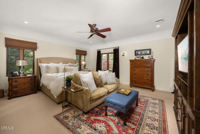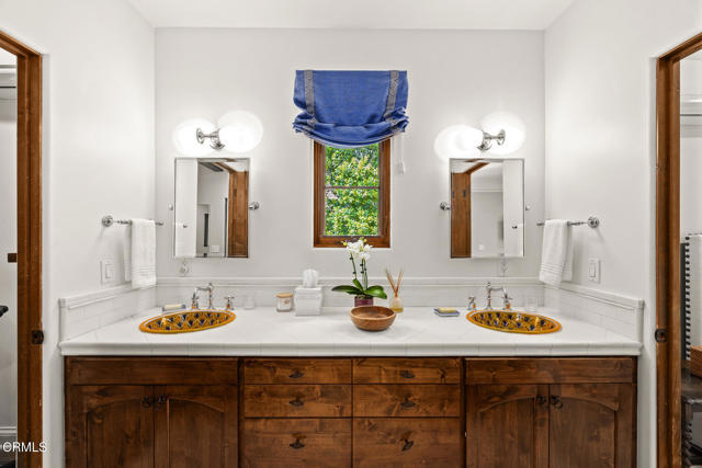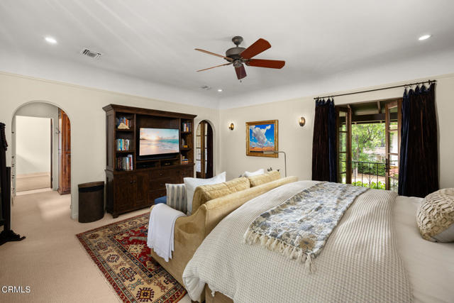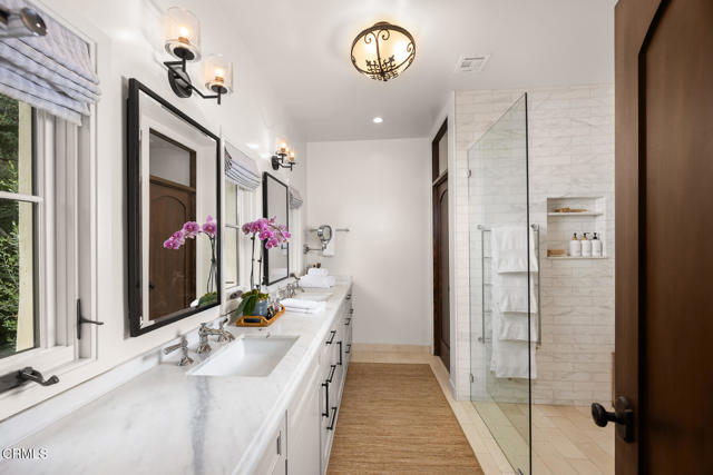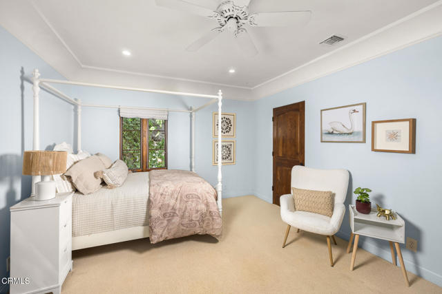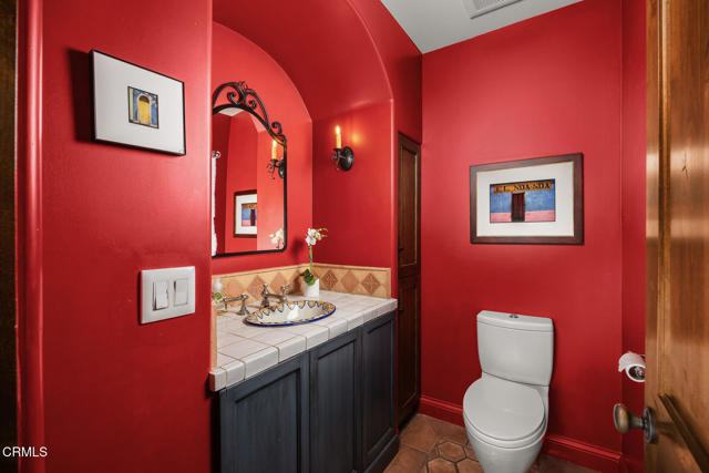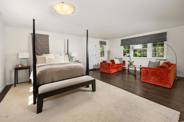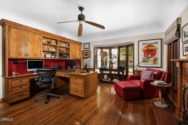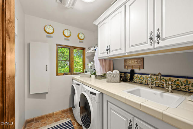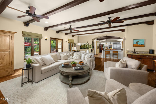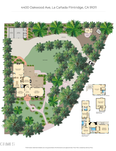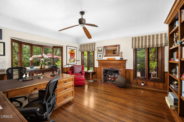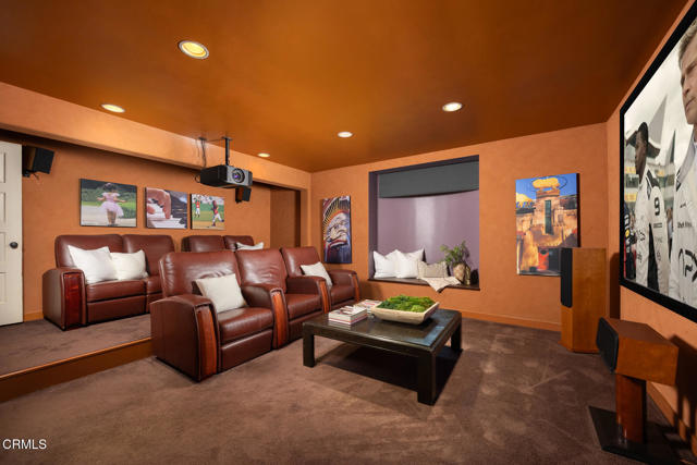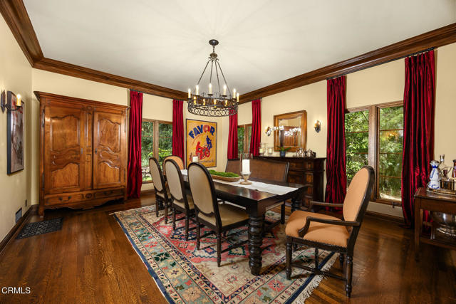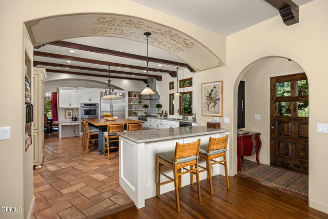 Welcome to 'Casa de Encinas', a masterfully reimagined estate that epitomizes timeless elegance and modern luxury in the coveted La Canada Flintridge. Nestled on over 3/4 of an acre of flat, gated land, this 5,515 sq. ft. home (including guest house), Italian Period Revival masterpiece--originally crafted in 1941 by renowned AIA architect Horatio W. Bishop-offers an unparalleled blend of architectural heritage, contemporary sophistication, and serene privacy. Enveloped by a canopy of oak trees, the estate welcomes you with manicured gardens, a pillared iron gate, and a flagstone path that winds past a tranquil fountain to the grand covered entry. The home's striking facade and commanding presence set the tone for the exquisite details within. A seamless marriage of original craftsmanship and modern updates. Hardwood floors lead from the vaulted foyer, where a spiral staircase with oak treads ascends gracefully beneath an original stained-glass window and chandelier. The formal living room with a stately fireplace, soaring ceilings, and French doors framing enchanting garden views. The formal dining room flows effortlessly into the chef's kitchen-A dream space featuring custom cabinetry, grand center island, stone countertops, top-tier appliances, and large pantry. A breakfast bar connects to the cozy yet spacious family room, with a second fireplace, dining nook, and seamless access to the outdoor patio. For work or leisure, the main level offers a light-filled office/library or bedroom, with built-ins and guest bath access, as well as a state-of-the-art private theater, equipped with surround sound and projection. The second-floor hosts three guest bedrooms in addition to a stunning primary suite. The spa-like primary bath boasts a double vanity, soaking tub, oversized shower, and private water closet. Two sets of French doors open to a covered, large balcony overlooking the lush grounds. Two guest rooms share a bath between, the third serviced by a guest bathroom in the hall. Meticulously landscaped grounds evoke the serenity of nearby Descanso Gardens, including multiple sitting patios and a 165-square-foot floral studio with temperature control. Tiled patios invite al fresco dining, and expansive lawn offers endless possibilities. Detached three-car garage, a workshop and a storage room. Above it, a private 624-square-foot guesthouse with a kitchenette, living area, bedroom, and 3/4 bath. A Rare opportunity for a discerning buyer.
