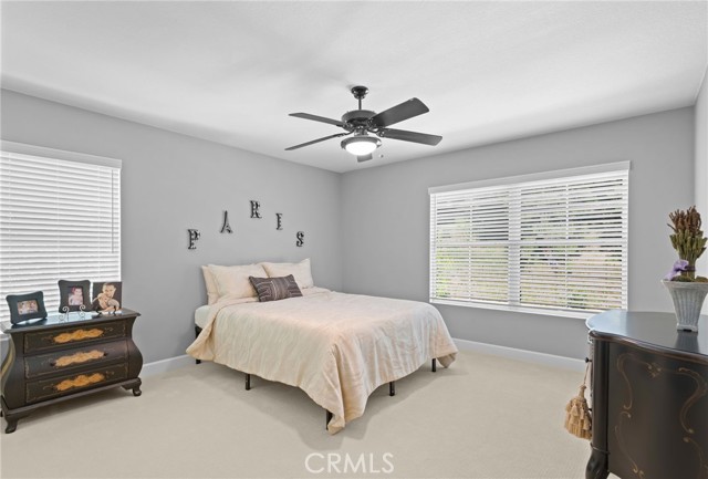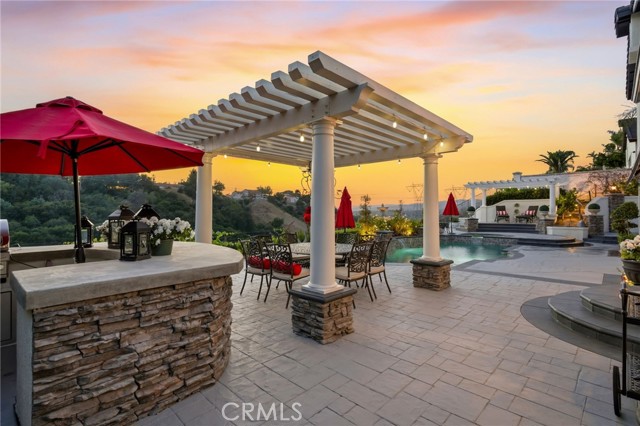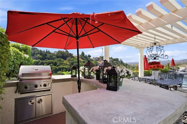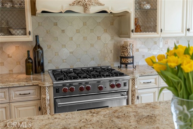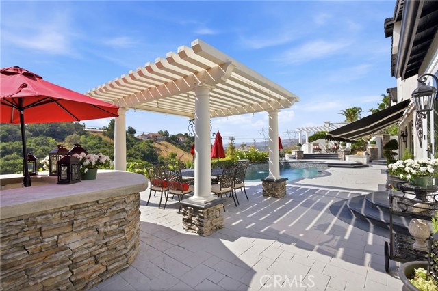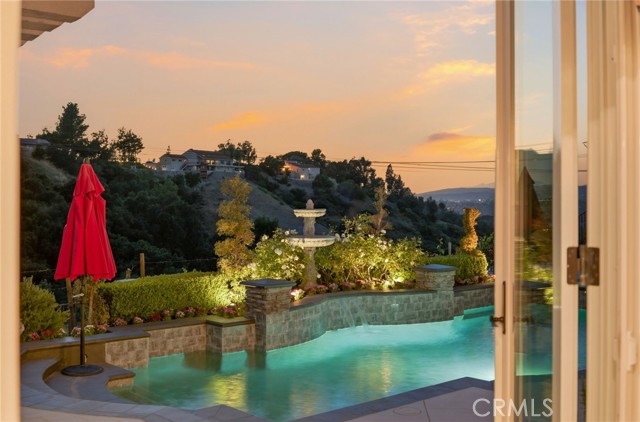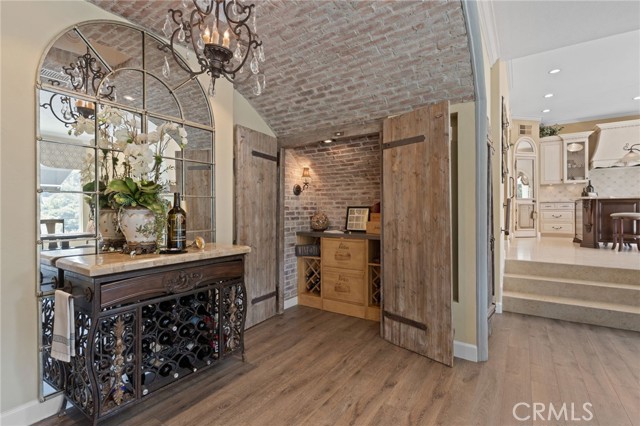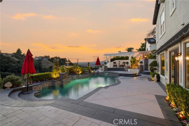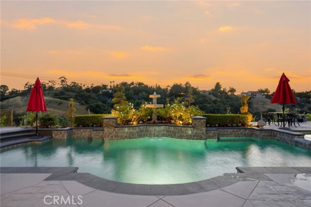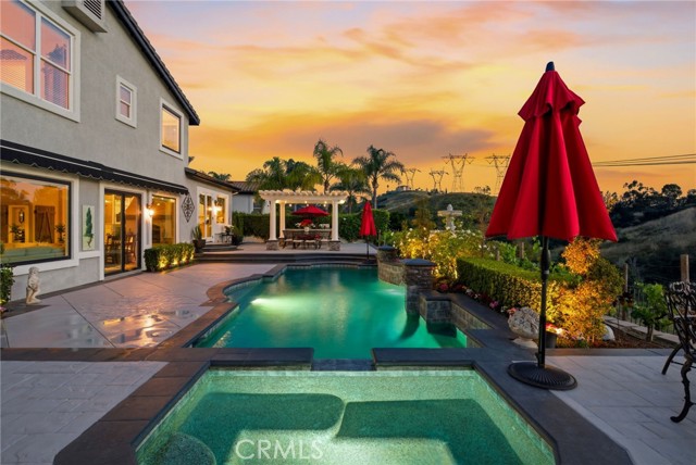 Stunning 5-Bedroom Estate with Pool, Vineyard Views & Luxury Upgrades in the coveted guard gated community of Belsomet. Make a grand entrance through exquisite wrought iron double doors into a breathtaking living room, where soaring vaulted ceilings and abundant natural light create a bright, airy, and sophisticated ambiance. This exceptional 5-bedroom home also features a spacious bonus room with the potential for a 6th bedroom, offering flexibility for growing households, guests, or a home office. The main level includes a highly desirable bedroom with a beautifully updated en suite bathroom—perfect for multigenerational living or visiting guests. At the heart of the home, the upgraded kitchen is a true showpiece, boasting gorgeous limestone with onyx inlay floors, granite countertops, an expansive island with breakfast bar seating, a dedicated eat-in dining area, and a premium Wolf 6-burner stove and oven—ideal for both everyday living and entertaining. The oversized family room provides a warm and inviting gathering space featuring a built-in media niche with storage and surround sound along with a custom wine cellar area and a hidden Viking dual-zone wine refrigerator, adding a unique touch of luxury and convenience. Upstairs, the primary suite has been tastefully remodeled into a private retreat, featuring a walk-in shower, freestanding soaking tub, a large vanity designed and custom closet built for comfort and style. In addition to the primary suite, the upstairs includes three additional bedrooms—one currently configured as a suite with an open layout that can easily be enclosed to create a separate bedroom, and another featuring its own en suite bathroom, offering added comfort and privacy for family or guests. Step outside into your own private Tuscan terrace. The resort-style backyard showcases a sparkling Pebble Tec pool and spa, a dramatic rock waterfall, and a fully equipped BBQ island. Relax or entertain under the pavillion while enjoying breathtaking views of the private canyon and surrounding vineyards. This one-of-a-kind property is situated on a single loaded street with no direct rear neighbors and offers the perfect blend of elegance, comfort, privacy and scenic beauty—an incredible opportunity you won’t want to miss.