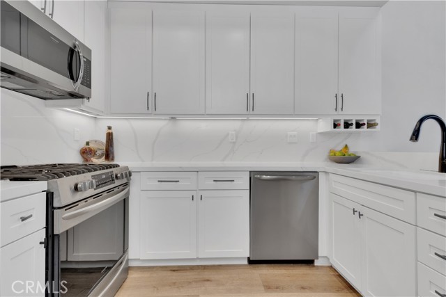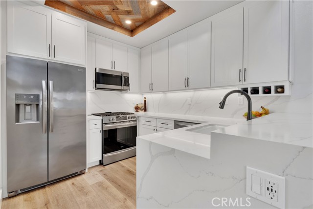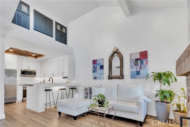 Welcome to a unique opportunity to own a fully upgraded one-bedroom, one-bath condo showcasing custom finishes and thoughtful enhancements throughout. Filled with ample natural light and featuring its own private balcony, this home offers a bright, open feel that complements its high-end upgrades. The expanded kitchen is beautifully designed with white shaker soft-close cabinetry, quartz countertops with a full slab backsplash, stainless steel appliances, under-cabinet LED lighting, and a reclaimed wood ceiling—perfectly blending warmth and modern style. Throughout the home, you’ll find luxury vinyl plank flooring, new baseboards, fresh interior paint, PEX plumbing, and a newer water heater. The spa-inspired bathroom is both functional and elegant, featuring a large walk-in shower with Italian porcelain tile, bench seating, and a dual-sink quartz vanity. Additional highlights include a separate water closet, a spacious walk-in closet, built-in linen cabinetry, and a skylight that enhances the natural light. A custom three-sided stone fireplace with reclaimed wood accents serves as a stunning focal point, while LED lighting throughout, a stacked washer and dryer conveniently located in the bathroom, and a versatile attic storage space with vaulted ceilings add to the home’s practicality. Complete with a detached single-car garage with storage (and conveniently located across from the front door), this turnkey residence offers the perfect blend of style, comfort, and quality craftsmanship.