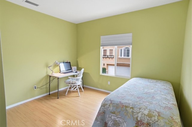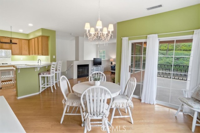 Desirable Valencia Cornerstone condominium offering comfort, privacy, and an ideal location. This 2-bedroom, 2-bath upper-level end unit features approximately 1,349 square feet and lives like a single-story home with no upstairs neighbors. - No Mello Roos Taxes, Warrantable, and also FHA spot approval eligible! The open layout is filled with natural light and enhanced by wood flooring, a cozy gas fireplace, and two spacious patio decks that extend the living space outdoors. The kitchen flows seamlessly into the main living areas, creating a functional and inviting environment. The primary suite includes a walk-in closet and a private bath with dual sink vanity. Additional highlights include inside laundry and a direct-access 2-car garage. Situated in a quiet cul-de-sac location within a low-density community featuring only three units per building, ample guest parking plus residents enjoy access to multiple pools, spas, BBQ areas, picnic spaces, and a playground. Conveniently located near paseos, trails, parks, shopping, dining, and top-rated schools.