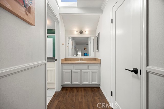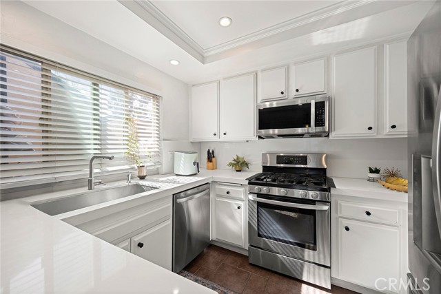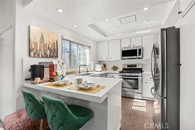 Located in the gated Millstream community, this rare end-unit offers exceptional privacy with only one shared wall and no one above or below. The upgraded kitchen is the centerpiece, featuring quartz countertops, full backsplash, white cabinetry, and LG stainless steel appliances. The light-filled living and dining areas overlook your private patio and are enhanced by soaring ceilings, elegant wainscoting, crown molding, ceiling fans throughout, gorgeous wood laminate flooring, and a NEST thermostat. The 2-bedroom, 1.25-bath layout includes a bright primary suite, flexible second bedroom or office, skylit bath, and in-unit laundry. Storage is abundant with a hallway closet, walk-in closet, built-ins, attic with pull-down ladder, and garage shelving. Enjoy resort-style living with streams, bridges, lush landscaping, pool, spa, and tennis courts, plus ample parking and a prime location within walking distance to shops and restaurants, close to beaches and freeway access. HOA covers water and trash—offering comfort, convenience, and a true sense of community living. A rare opportunity in Millstream with no other units currently on the market—take a look at the 3D tour and schedule your private showing before it’s gone.